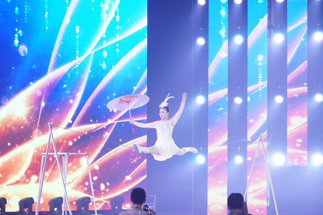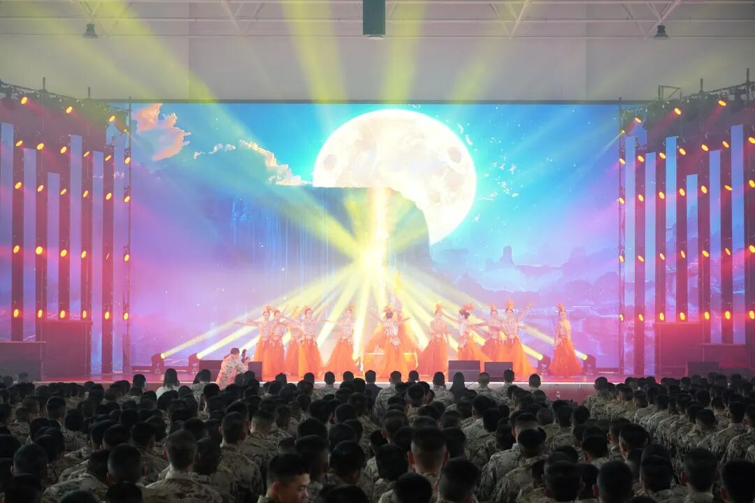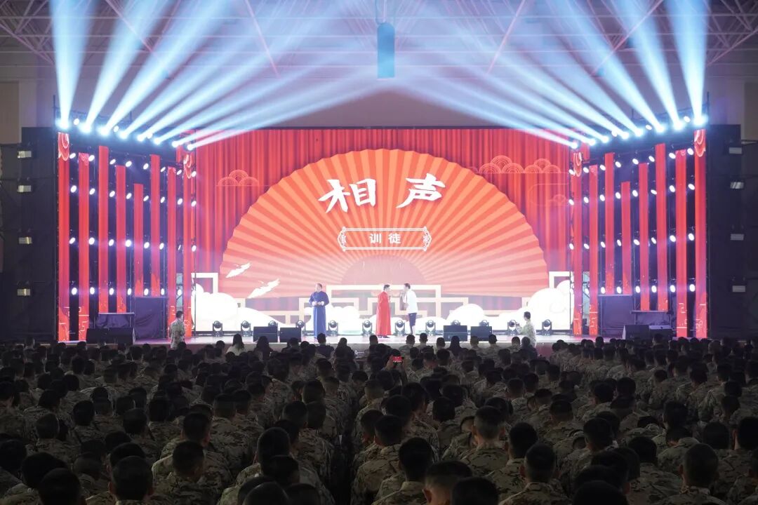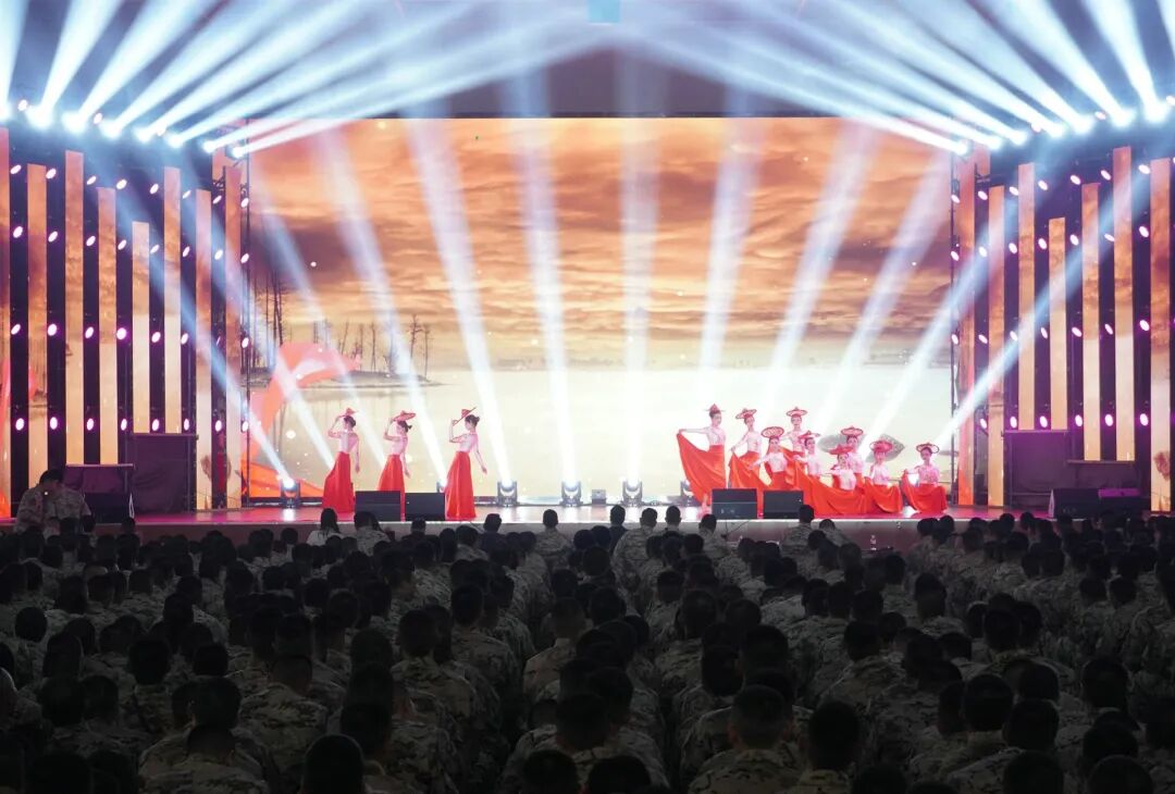 杂技《龙凤呈祥》以精准的配合与惊险的动作,展现中华传统技艺的独特魅力。当群口相声《训徒》的包袱接连抖响,官兵们此起彼伏的欢笑与掌声,让演出现场化作欢乐的海洋。舞蹈《珊瑚颂》以婉转旋律抚慰人心,《我相信》则以青春节拍激荡热血,其间,对口相声《欢歌笑语》以诙谐互动增添轻松色彩,而压轴舞蹈《山河赋》则以磅礴气势铺展万里江山的壮丽画卷。