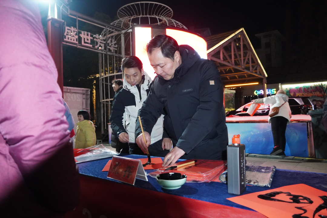 晚上天气寒冷,文创园内气氛火热。书法家们神情专注、饱蘸浓墨,笔锋流转间一幅幅春联、福字跃然于纸上,各种书体、尽显神韵,既有传统佳句,也有群众“私人订制”,现场洋溢着浓厚的年味。书法家们不光为群众书写春联福字,还手把手教感兴趣的小朋友自行创作,也在小朋友心中种下一颗艺术的种子。