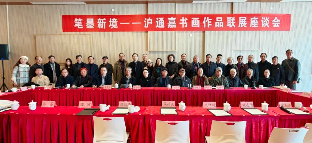 来自上海、嘉兴、南通三地的领导嘉宾集体观展。观展结束后,随即召开了展览座谈会。围绕“笔墨新境”的展览主题,与会人员就海派艺术的当代演进、江海文化与江南文脉在书画中的融合表达,以及传统笔墨语言如何回应新时代审美等核心问题展开了热烈对话。