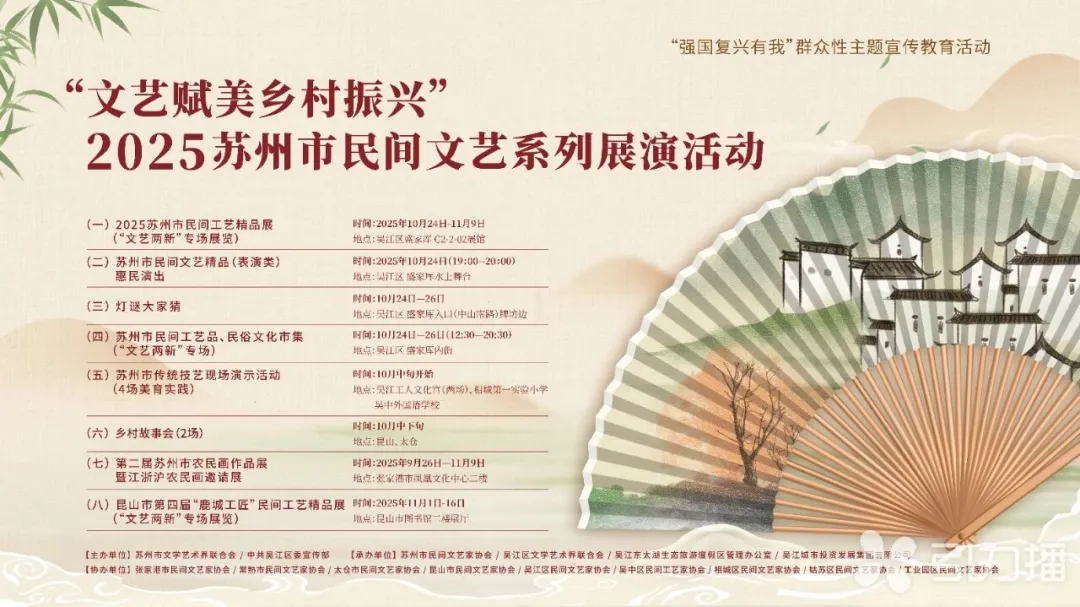 为深入学习贯彻党的二十大和二十届二中、三中、四中全会精神,深入学习贯彻习近平文化思想,10月24日,由苏州市文学艺术界联合会、中共吴江区委宣传部主办,苏州市民间文艺家协会、吴江区文学艺术界联合会、吴江东太湖生态旅游度假区管理办公室、吴江城市投资发展集团有限公司共同承办的“文艺赋美乡村振兴”2025苏州市民间文艺展演活动拉开帷幕。