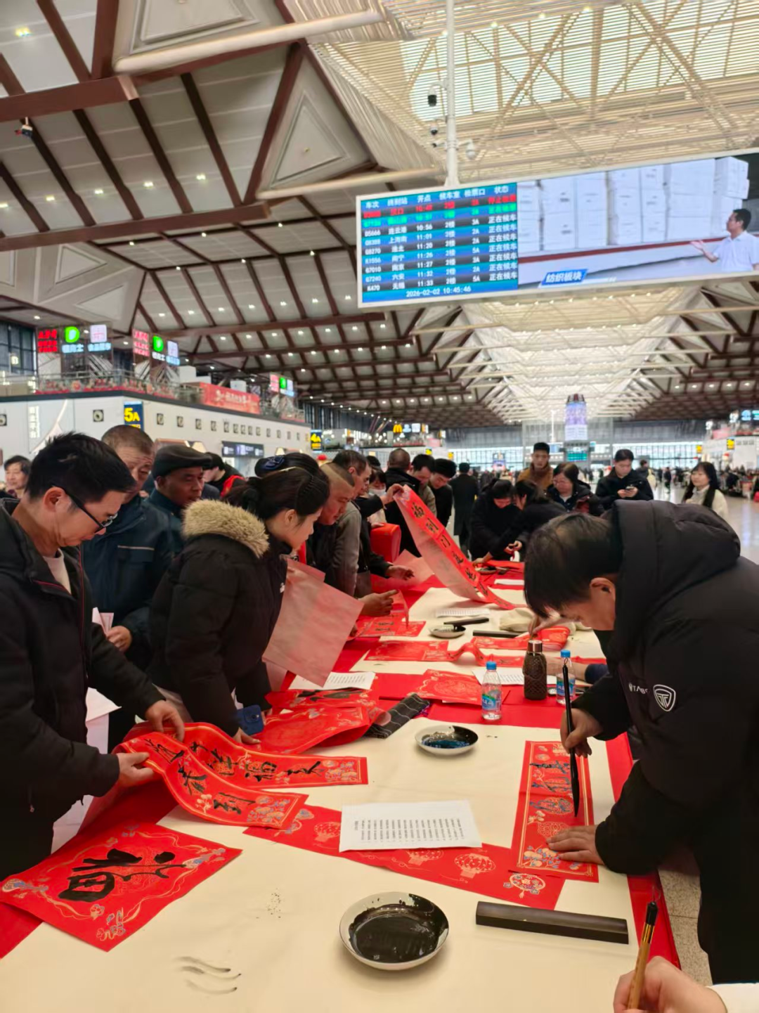 往来旅客纷纷驻足围观,有的在旁静静欣赏文艺家们的创作风采,有的主动上前邀请文艺家书写专属祝福,现场一派热闹祥和的新春景象。“老师写的特别好,我要把这份祝福带回家。”一位返乡旅客捧着刚写好的春联,脸上洋溢着幸福的笑容。