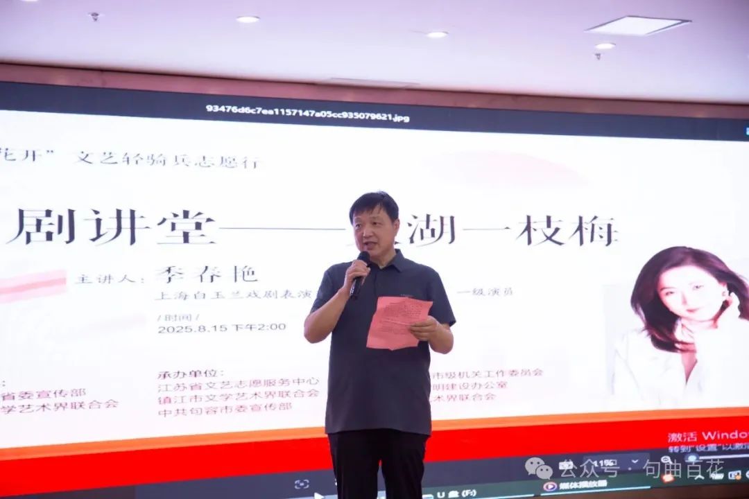 8月15日下午,由中共江苏省委宣传部、江苏省文联主办,江苏省文艺志愿服务中心、镇江市文联、中共句容市委宣传部承办,中共句容市委市级机关工委、句容市文明办、句容市文联协办的“茉莉花开”文艺轻骑兵志愿行句容站暨句容市级机关“文艺大讲堂”在句容市党员服务中心开展。