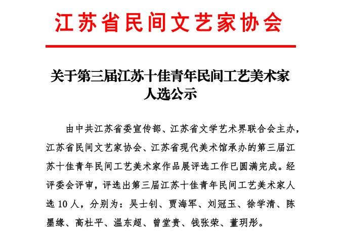 关于第三届江苏十佳青年民间工艺美术家人选公示