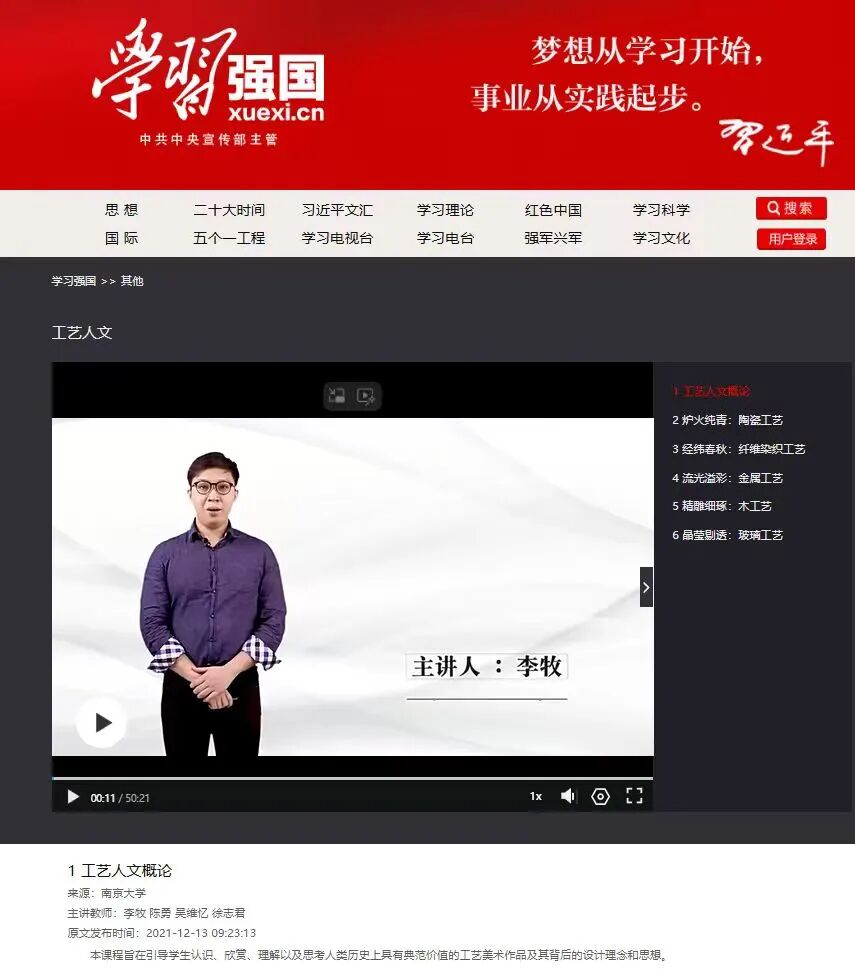 2025年,主持《工艺人文》学习强国,课程“工艺人文”入选江苏高校美育精品课程