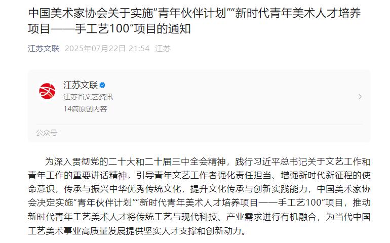 为深入贯彻党的二十大和二十届三中全会精神,践行习近平总书记关于文艺工作和青年工作的重要讲话精神,引导青年文艺工作者强化责任担当、增强新时代新征程的使命意识,传承与振兴中华优秀传统文化,提升文化传承与创新实践能力,中国美术家协会决定实施“青年伙伴计划”“新时代青年美术人才培养项目——手工艺100”项目,推动新时代青年工艺...
