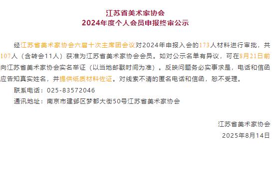 经江苏省美术家协会六届十次主席团会议对2024年申报入会的173人材料进行审批,共107人(含转会11人)获准为江苏省美术家协会会员。