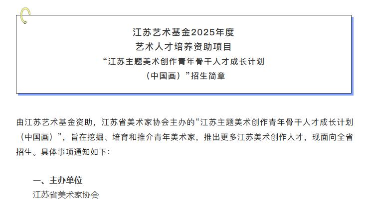 由江苏艺术基金资助,江苏省美术家协会主办的“江苏主题美术创作青年骨干人才成长计划(中国画)”,旨在挖掘、培育和推介青年美术家,推出更多江苏美术创作人才,现面向全省招生。