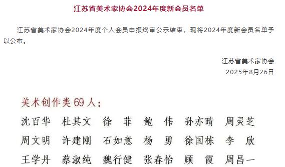 江苏省美术家协会2024年度个人会员申报终审公示结束,现将2024年度新会员名单予以公布。