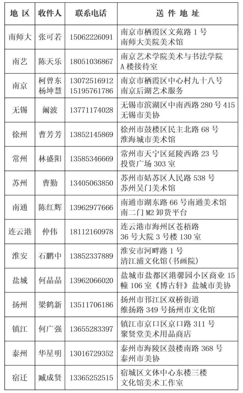 1、初评入选作者自愿、尽快联系各会员单位联系人(南师大、南艺作品交所在美术学院,南通地区作品可直送,具体联系人见下方表格),由各地区组织统一送至南通市展览地址参加复评。