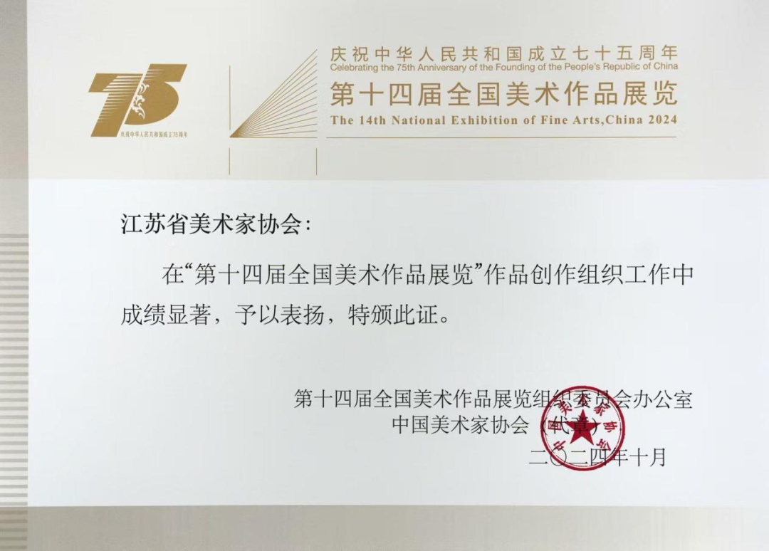 另一方面,省美协积极动员组织全省美术家进行创作备战,先后召开动员会、辅导讲座等20余场,为美术家们提供了专业的指导和交流的平台,显著提升了江苏美术家的创作水平与冲刺实力。最终,江苏在第十四届全国美展中斩获佳绩,入展作品296件,进京作品36件,入选数量较上届实现稳步增长。其中,中国画、版画两大画种的入选数量均位列全国第二,中国画与油画选送入展率高达90%,位居全国首位。省美协获评中国美协颁发的展区承办组织工作奖、作品创作组织工作奖。