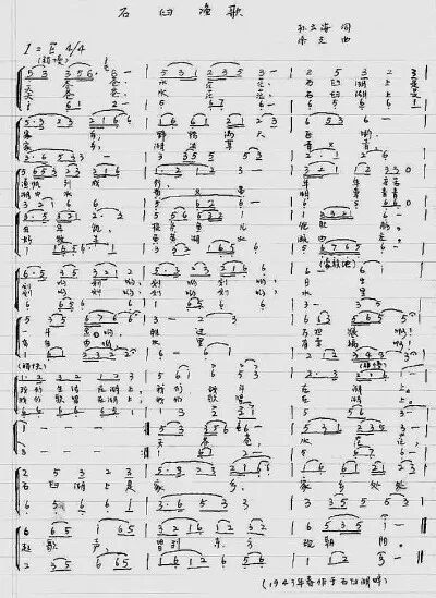 那时候,父亲在新四军第一师巡视团工作。他们一行十几人从苏中南下,几经辗转到了溧水新桥区。当地的石臼湖风景如画,水天一色,渔帆成行。可生活在这里的老百姓过的却是“年年辛苦年年饥,捉条鱼儿饱肚肠”的沉重日子。父亲后来讲,现实巨大的反差撞击着他——山河的壮美与百姓的艰难,和平的无望与斗争的残酷。一股强烈的冲动涌上心头,他捡起湖边一枚贝壳,在沙滩上写下了心底冒出来的句子。同行的涂克伯伯,是位有才华的文艺战士。他读到歌词后,连声说:“写得好啊!有生活,乐感也强!”父亲回忆说,涂克伯伯很兴奋,带着一种创作的急切感,当晚就在借宿的茅屋里点起昏黄的油灯,连夜“突击”谱曲。第二天清晨,《石臼渔歌》的旋律就像奔涌的湖水流淌出来——