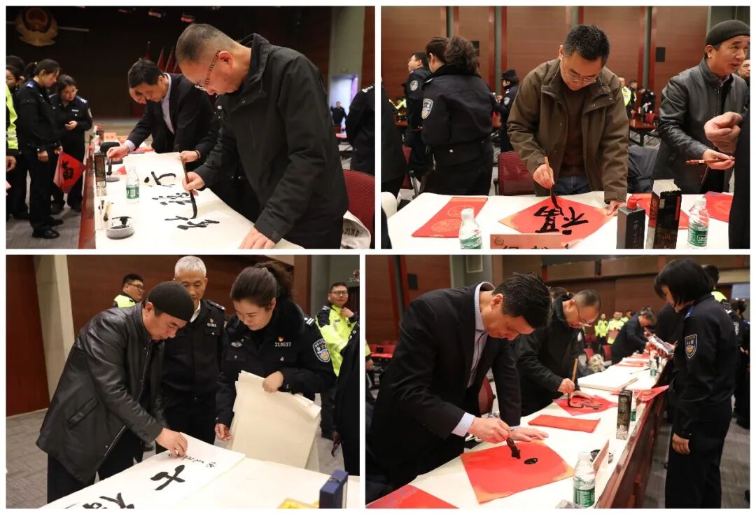 在南京市公安局交通管理局活动现场,江苏省书协副主席、市书协主席谢少承,省书协秘书长纪松、市公安文联主席张勇一行专程到访,开展“金盾耀春驰骏马 丹心护岁保平安——2026丙午马年‘万福迎春’”活动。市局政治部副主任万斌,局部分班子成员,市局组宣处相关负责同志及各大队民警、辅警代表近150人参加。书法家们挥毫泼墨,创作出一幅幅寓意吉祥的春联和一张张飘逸饱满的“福”字,表达对公安干警辛勤付出的诚挚问候。民警、辅警们热情参与,现场洋溢着浓厚的节日氛围。