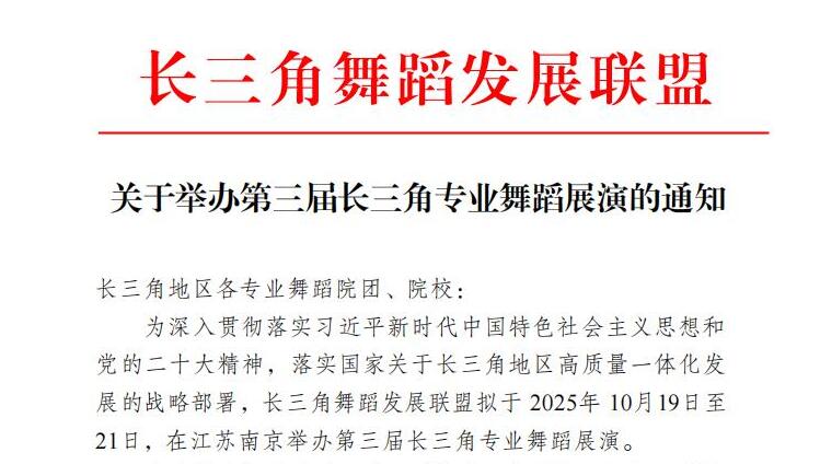 为深入贯彻落实习近平新时代中国特色社会主义思想和党的二十大精神,落实国家关于长三角地区高质量一体化发展的战略部署,长三角舞蹈发展联盟拟于 2025年 10月19日至21日,在江苏南京举办第三届长三角专业舞蹈展演。