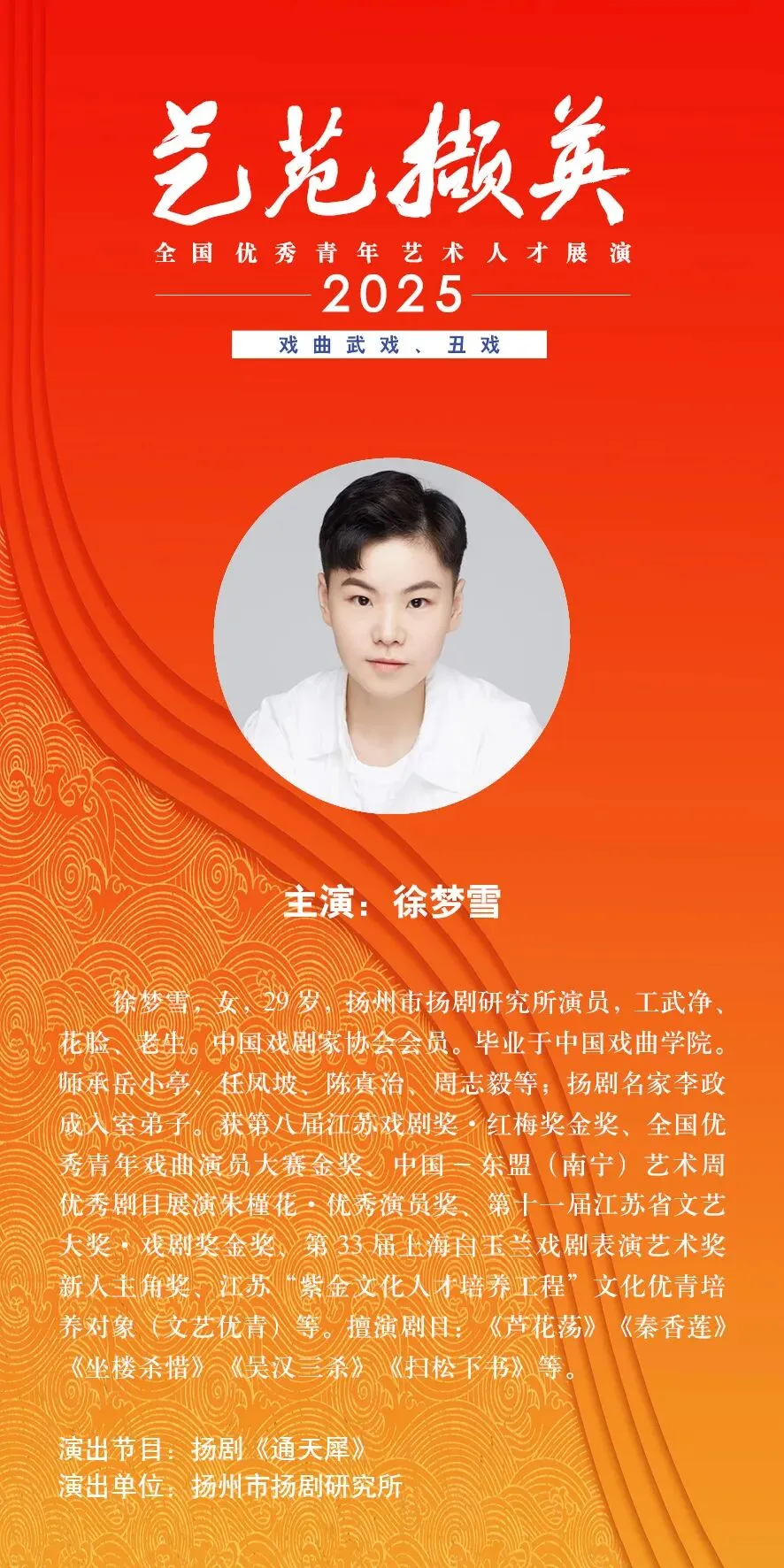 此次展演是全国戏曲武戏、丑戏领域的一次高水平盛会,旨在发掘培养优秀青年艺术人才、推动传统戏曲传承发展。徐梦雪凭借多年深耕舞台的积累,此前已斩获第八届江苏戏剧奖·红梅奖金奖、第33届上海白玉兰戏剧表演艺术奖新人主角奖等多项重要荣誉,入选江苏“紫金文化人才培养工程”文化优青培养对象等人才计划。此次进京展演,不仅是她个人艺术水平的一次集中展示,更让扬剧这一源自江苏的地方戏曲瑰宝登上全国性舞台,为剧种的传播推广注入新活力。