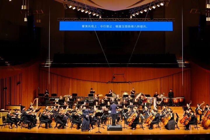 郝维亚作曲的《音乐故事——孙武》让整个管弦乐队为昆曲须生徐昀的念白伴奏。徐昀的念白昆腔纯正,铿锵顿挫,余韵悠长,诵出孙武于乱世感怀民生多艰而精研兵法以止戈的人生追求,以及“上兵伐谋,其次伐交,其次伐兵,其下攻城”的政治智慧。一般来说,昆曲武场以打击乐器伴奏相对热闹,文场则仅以曲笛、笙、三弦、琵琶等少量乐器辅助伴奏相对较静,而西方交响乐的音乐织体密度很高,但在这支曲子中,整个管弦乐队的伴奏并不喧宾夺主,而是配合昆曲须生的念白内容,在恰当的时刻自然合理地起到或营造叙事背景、或烘托情境气氛、或契合角色心境的作用,让观众更沉浸地与念白所吟诵的孙武的故事和心境共鸣。念到终处,曲到终处,观众仍有余音绕梁之感。