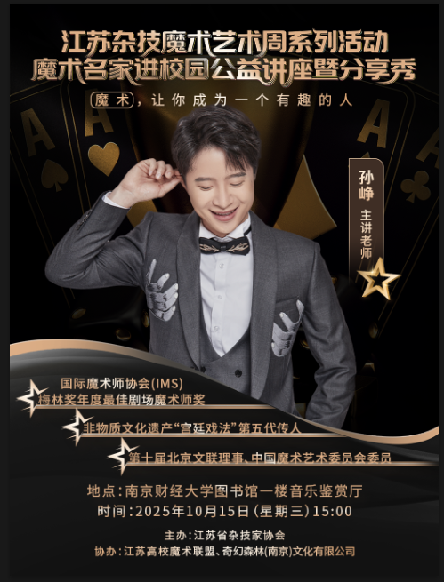 魔术名家进校园公益讲座暨分享秀将于10月15日15:00在南京财经大学图书馆一楼音乐鉴赏厅举办。本次活动邀请了优秀青年魔术师、北京市杂协理事孙峥分享自己从大学魔术社到专业魔术师的经历,畅谈自己的艺术感悟。
