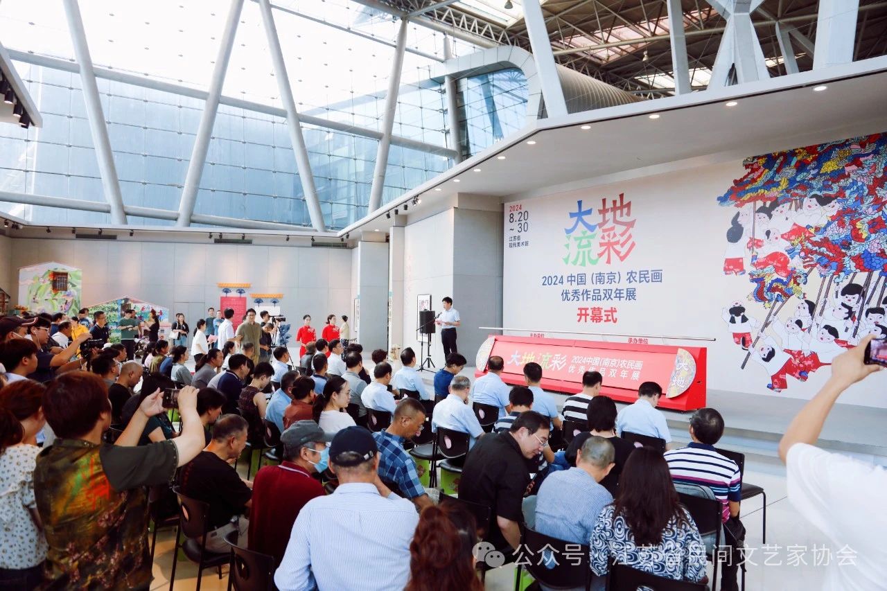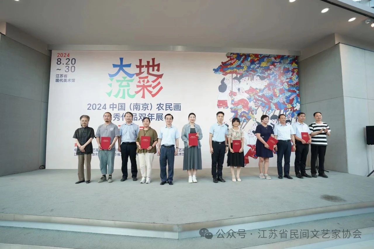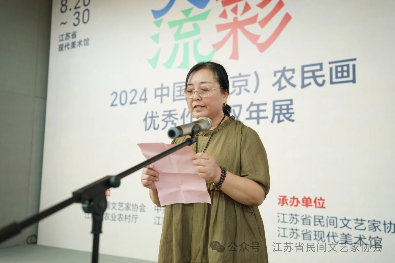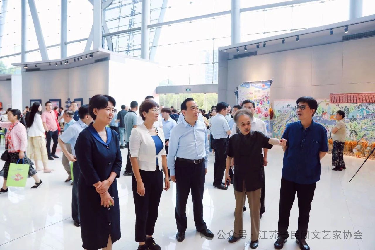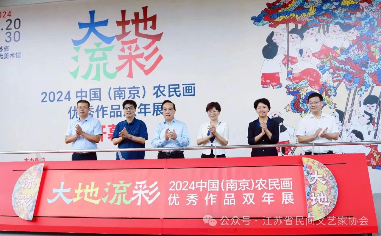 8月20日,由中国民间文艺家协会、中共江苏省委宣传部、江苏省农业农村厅、江苏省文学艺术界联合会主办,江苏省民间文艺家协会、江苏省现代美术馆承办的“大地流彩——2024中国(南京)农民画优秀作品双年展”在江苏省现代美术馆开幕。省政协原副主席、省乡村振兴研究会会长王荣平,省委宣传部副部长徐宁,省文联主席章剑华,省文联党组书记、副主席、书记处第一书记常胜梅,中国民协分党组成员、副秘书长吕骥,省农业农村厅副厅长、省乡村振兴局局长朱国兵,省文联党组成员、书记处书记何超,省乡村振兴研究会秘书长苏慧军,省委宣传部文艺处处长高民,省农业农村厅农村社会事业促进处处长徐丙奇,省乡村振兴研究会乡村文化振兴专委会主任樊万朝,省民协主席陈国欢,省民协副主席张丹,以及省民协理事、评委,农民画画家、农民画画乡的代表,省文联各部门、协会和单位的负责人等出席开幕式。
