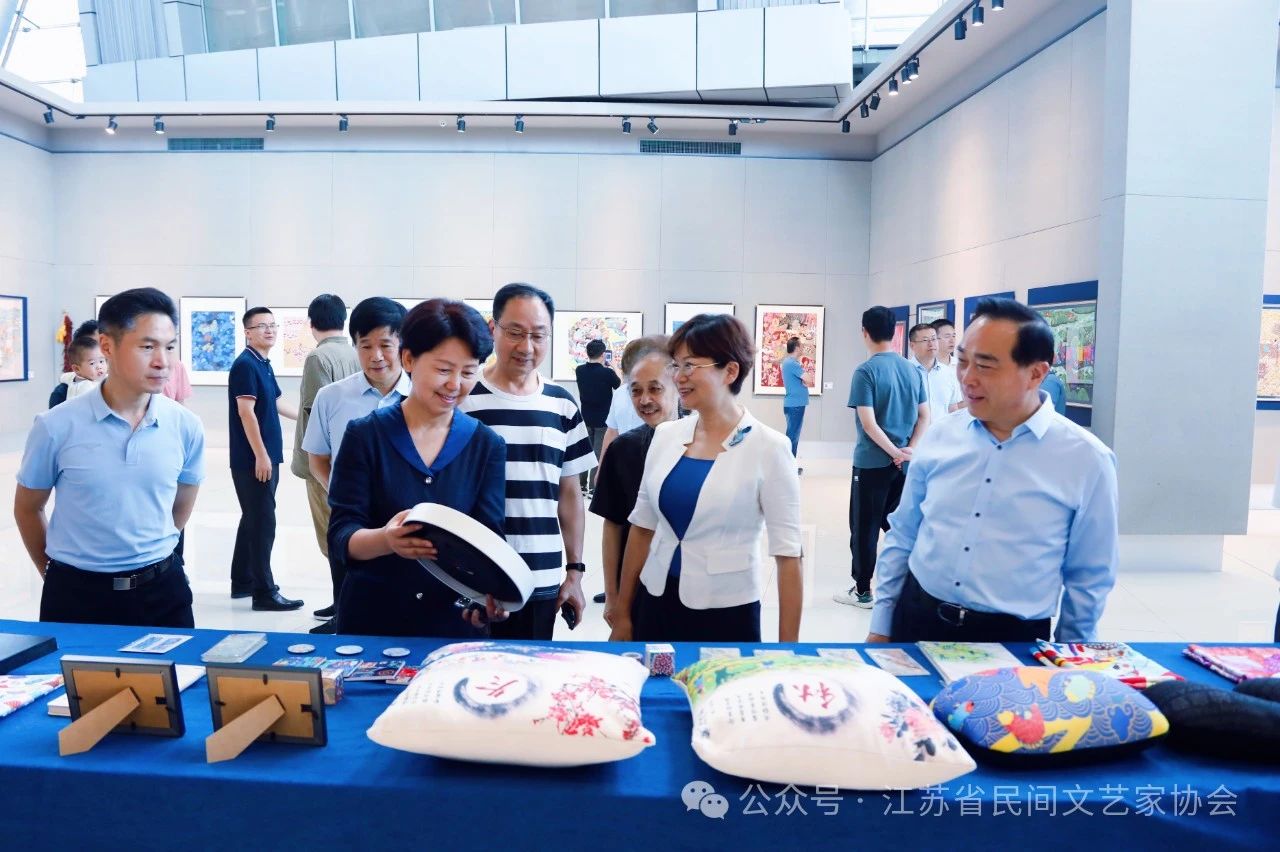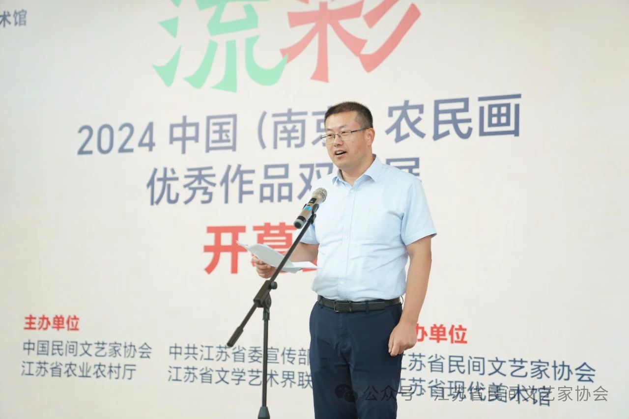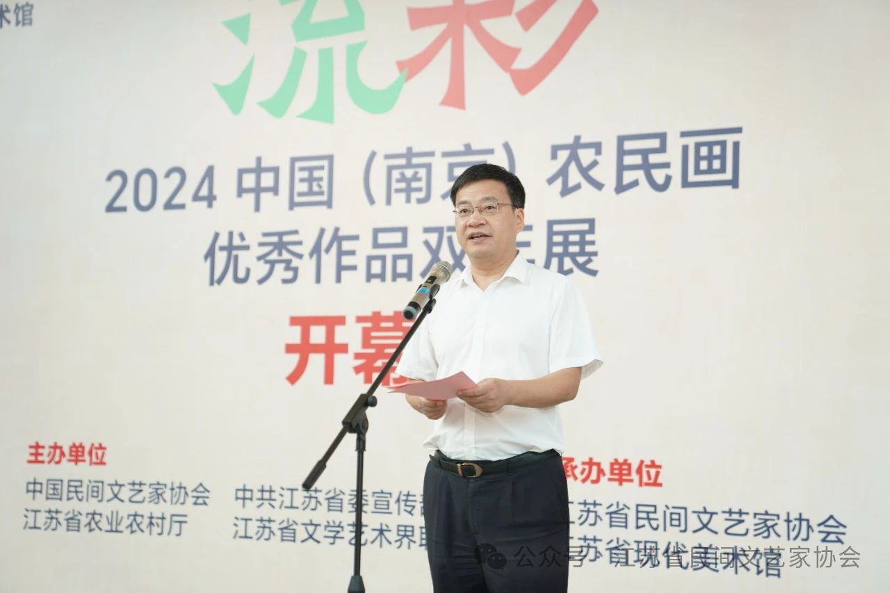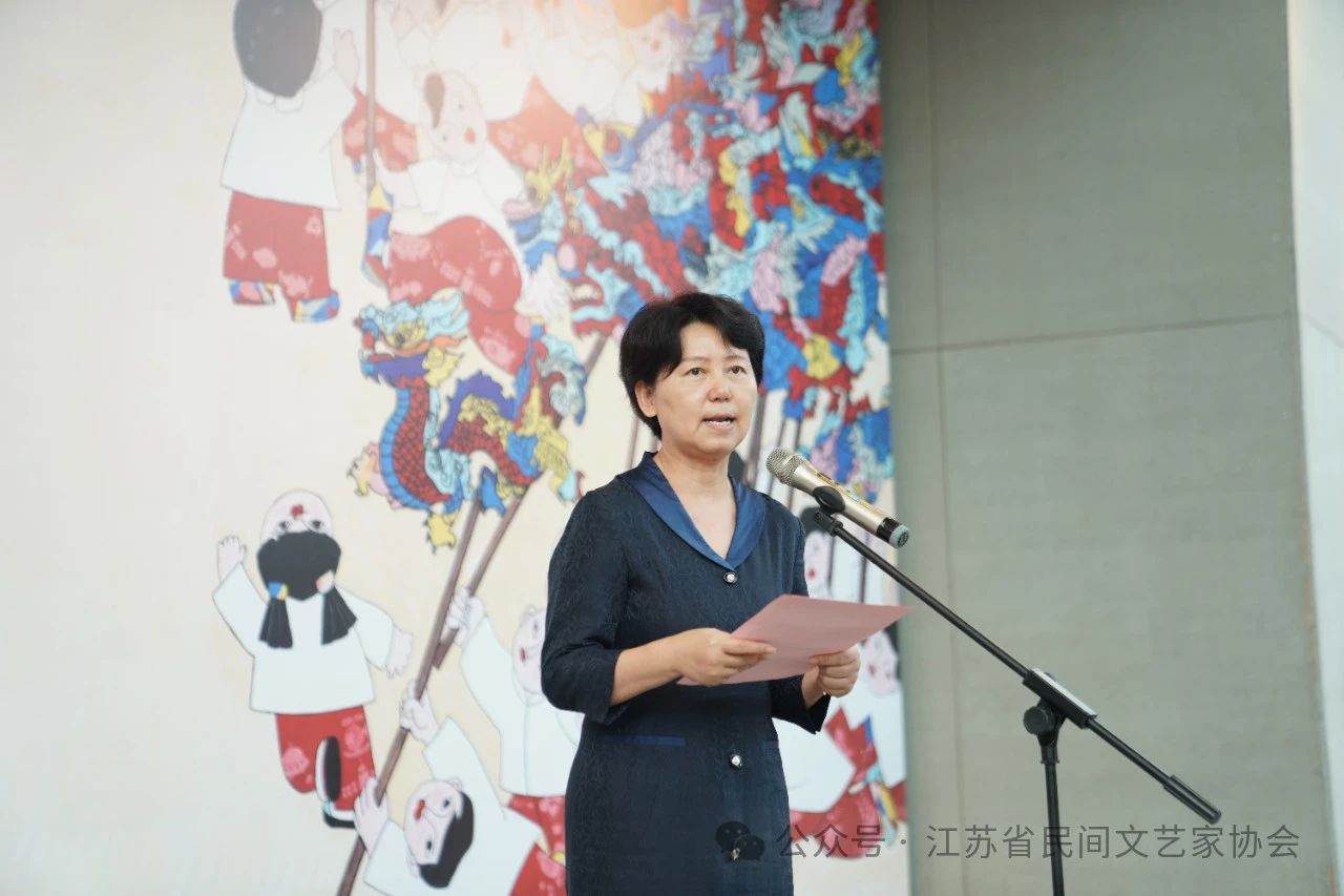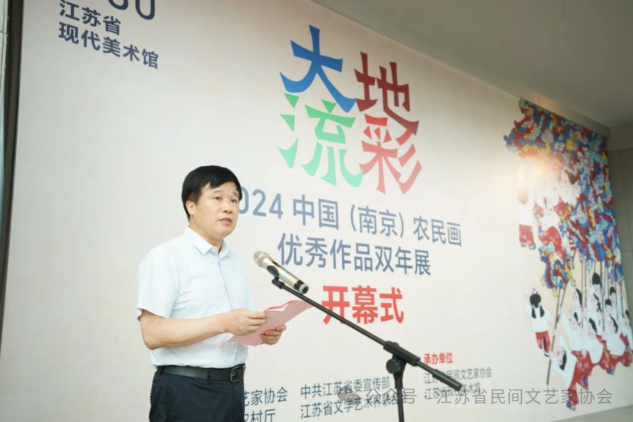 8月20日,由中国民间文艺家协会、中共江苏省委宣传部、江苏省农业农村厅、江苏省文学艺术界联合会主办,江苏省民间文艺家协会、江苏省现代美术馆承办的“大地流彩——2024中国(南京)农民画优秀作品双年展”在江苏省现代美术馆开幕。省政协原副主席、省乡村振兴研究会会长王荣平,省委宣传部副部长徐宁,省文联主席章剑华,省文联党组书记、副主席、书记处第一书记常胜梅,中国民协分党组成员、副秘书长吕骥,省农业农村厅副厅长、省乡村振兴局局长朱国兵,省文联党组成员、书记处书记何超,省乡村振兴研究会秘书长苏慧军,省委宣传部文艺处处长高民,省农业农村厅农村社会事业促进处处长徐丙奇,省乡村振兴研究会乡村文化振兴专委会主任樊万朝,省民协主席陈国欢,省民协副主席张丹,以及省民协理事、评委,农民画画家、农民画画乡的代表,省文联各部门、协会和单位的负责人等出席开幕式。