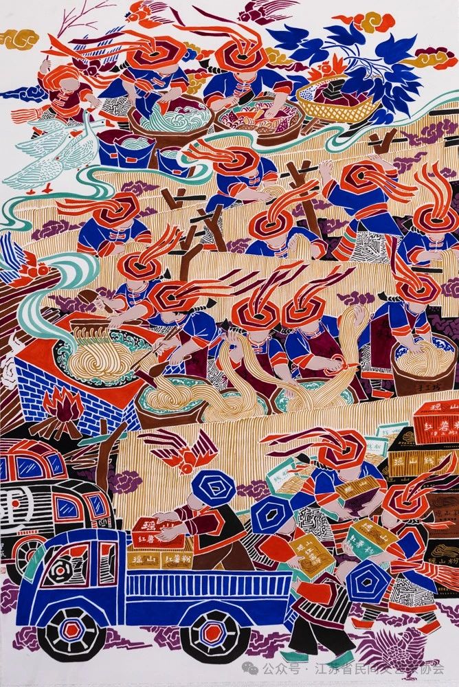 大地流彩-2024中国(南京)农民画优秀作品双年展自5月份发出征稿通知,截止7月10日,共收到应征作品1815件,涉及30个省、市、自治区,覆盖了全国主要农民画画乡,收稿数量为历年来最多。评审委员会来由来自全国农民画专家组成,经过初选和终选,共选出150件优秀作品参加展览,其中收藏作品10件。这些作品色彩艳丽却又彰显着率真质朴的气质,多角度反映了农村巨变和民俗民风,描绘了新时代农村精神文化风貌。在展览期间,同时展出了来自江苏射阳、上海金山、山东日照的农民画衍生品,带有农民画设计的丝巾、抱枕、手机链、手机壳、笔记本吸引了现场观众驻足欣赏,彰显了农民画在传承传播过程中的创造性转化、创新性发展。