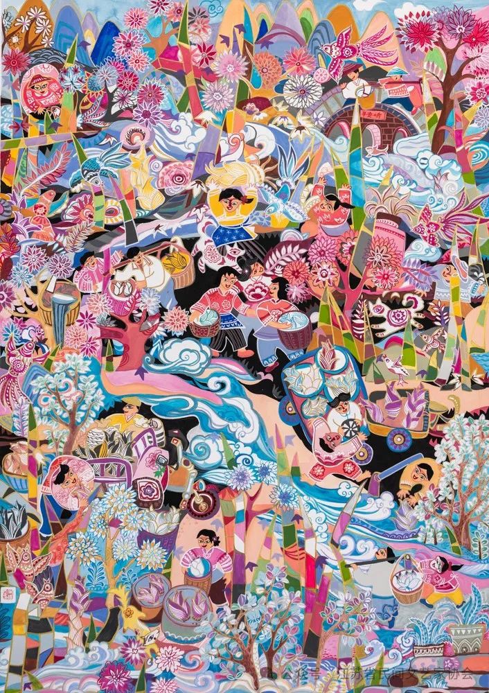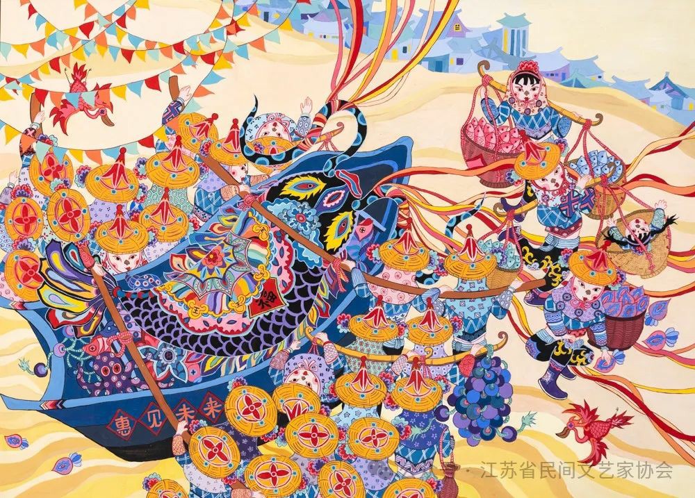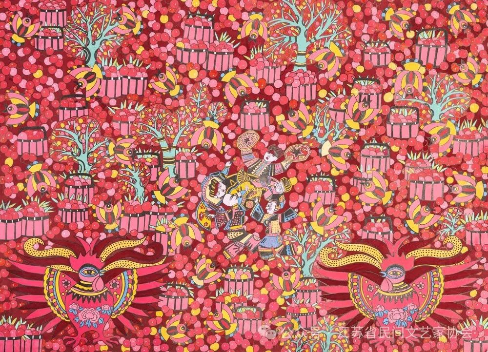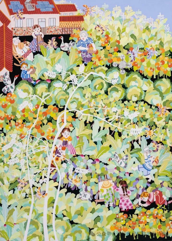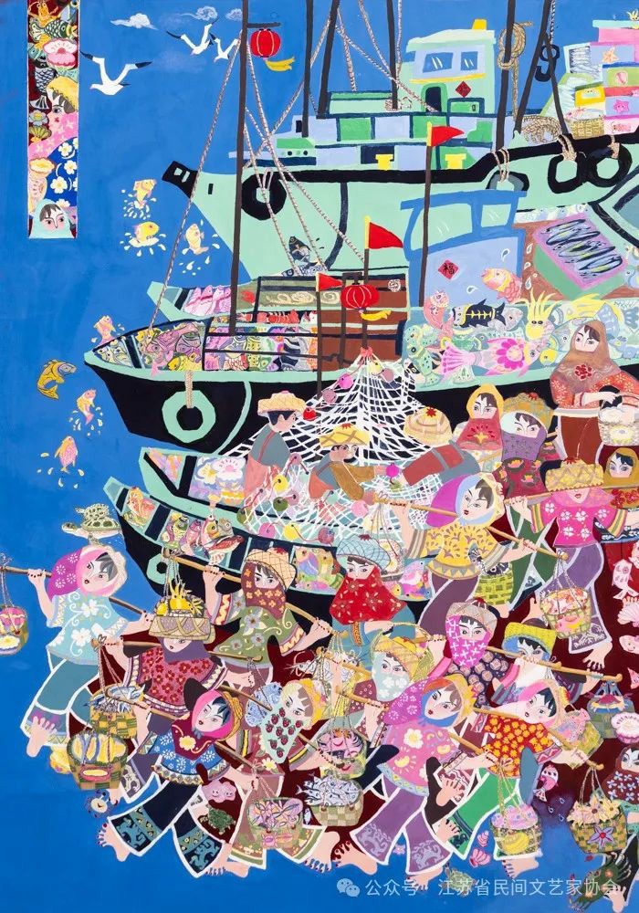 编者按:8月20日,由中国民间文艺家协会、中共江苏省委宣传部、江苏省农业农村厅、江苏省文学艺术界联合会主办,江苏省民间文艺家协会、江苏省现代美术馆承办的“大地流彩——2024中国(南京)农民画优秀作品双年展”在江苏省现代美术馆开幕。本次展览共展出150件优秀作品,其中收藏作品10件。这些作品色彩艳丽却又彰显着率真质朴的气质,多角度反映了农村巨变和民俗民风,描绘了新时代农村精神文化风貌。现将10件收藏作品刊登,以飨读者。