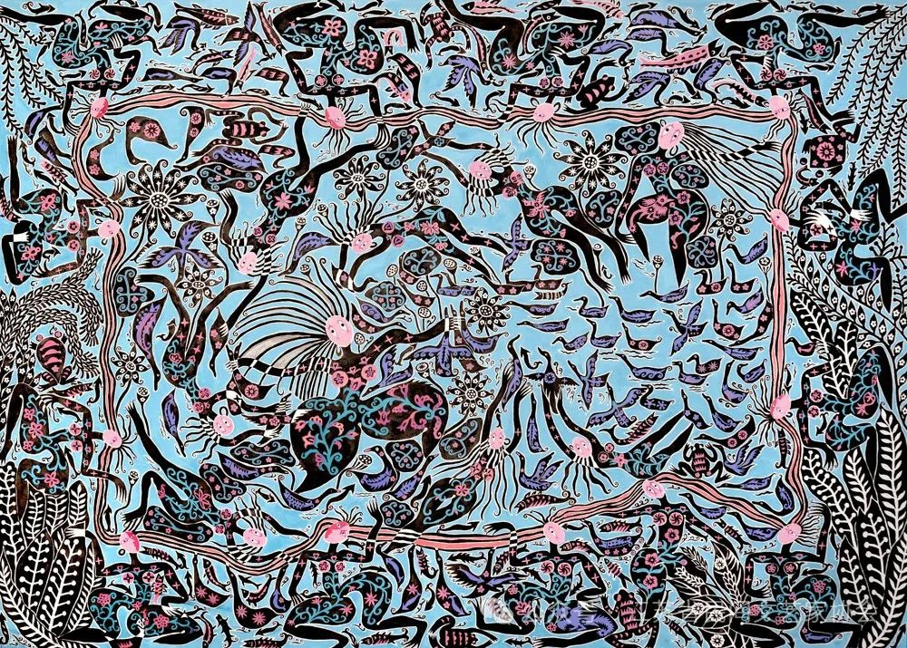 王源:《盛世欢歌》主要表现了我国北方鄂伦春族人民与来自天南地北的游人欢聚一堂,其乐融融共同欢庆鄂伦春族传统节日的热闹场面,饱满丰富且疏密适中的节奏构图,生动稚拙亦粗犷奔放的人物形态,冷暖对比又切合适中的色调运用使作品即活泼生动又兼具观赏性。整幅画面彰显了新时代下各民族人民大团结的伟大愿景,更是体现了北方地区通过开发特色旅游路线与独特的自然民俗资源充分结合,用实际行动践行“绿水青山就是金山银山”的发展理念。