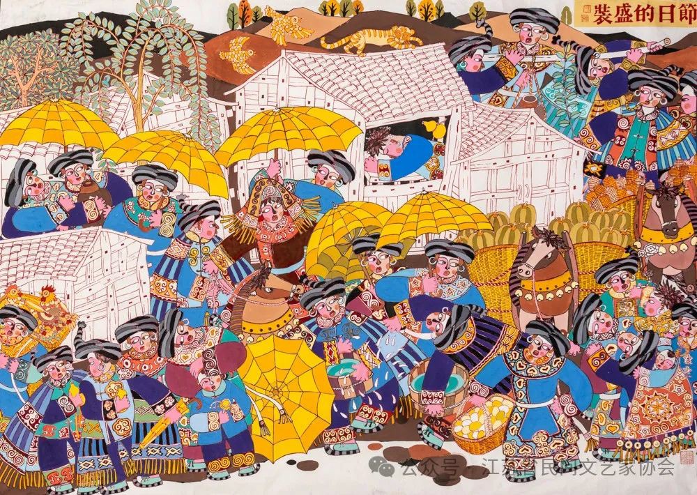 徐承波:《节日的盛装》这幅作品以俯视的视角描绘一场宏大热闹的彝族民间盛装嫁女场面,在这幅作品中,主人公新娘居于整幅画中央,突出本幅画的婚礼主题。所描绘的新娘身穿彝族传统特色的新娘服饰,作品中的每一位人物活灵活现,有撑伞的,有洒水的,有挑酒的,有背粮食的……这些都是彝族嫁女的传统习俗,无不彰显着彝族儿女在新时代下充满幸福的快乐生活。画面中的人物,每一个人神态迥异,一个又一个小人物在精巧的构思下罗列在一起,构成了这一幅盛装嫁女的热闹非凡的喜悦场面。