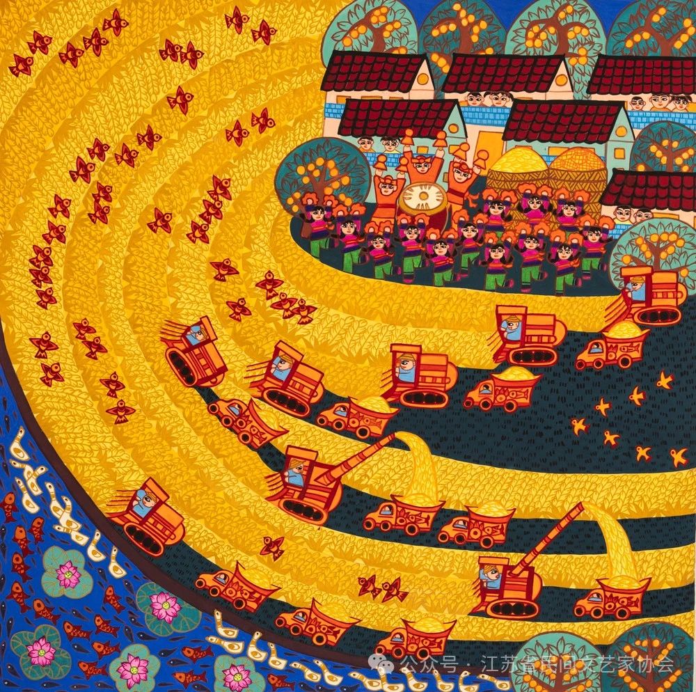 丁广华:《大地流金》画面中金黄色的稻田呈现出丰收的景象,多台收割机在稻田里收割。在田头村边,人们打起丰收鼓,跳起丰收舞,欢庆丰收。画面构图为流线型,像是金色在流淌,大地如黄金一般闪烁。我表达了大地富饶、生机勃勃的景象,寓意着繁荣和幸福。农民画属于民间绘画,色彩艳丽,造型夸张,构图饱满,质朴自然,乡土气息浓郁,描绘的是生产劳动、丰收场景、乡风民俗、乡村美景、美好生活、时代变迁等,表达对家乡的热爱,对美好生活的向往,对这个伟大时代的赞美之情。