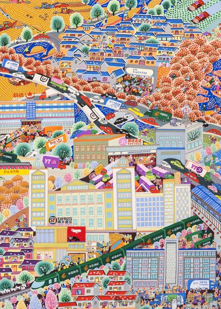 戚海彬:《快递千里,物流万家》以现代农村为题材,浓墨重彩地描绘了现代服务业和“三农”工作相互促进,共同发展的美好画卷,作者有代表性地撷取了最能表达主题的场景,结构成画。如丰收的景象,5G基站和电商服务站,顺丰、中通、联通、韵达、邮政等快递企业将服务的触角向农村延伸,打通了电子商务进农村的最后一百米,实现了工业品下乡,农产品进城的线上线下双线运行,为农民的放心消费、安全消费和便捷消费提供了保障。整幅作品既有深厚的乡土气息,又不乏现代生活元素,向人们展示了一幅安适、恬静、充满生机和希望的美丽的现代化农村场景。