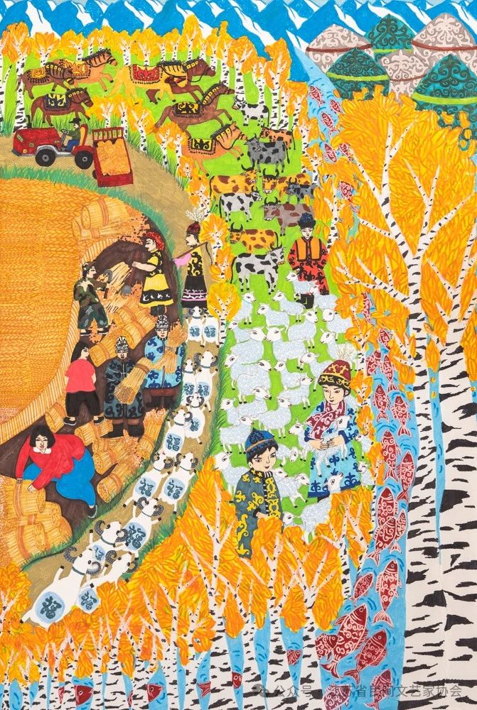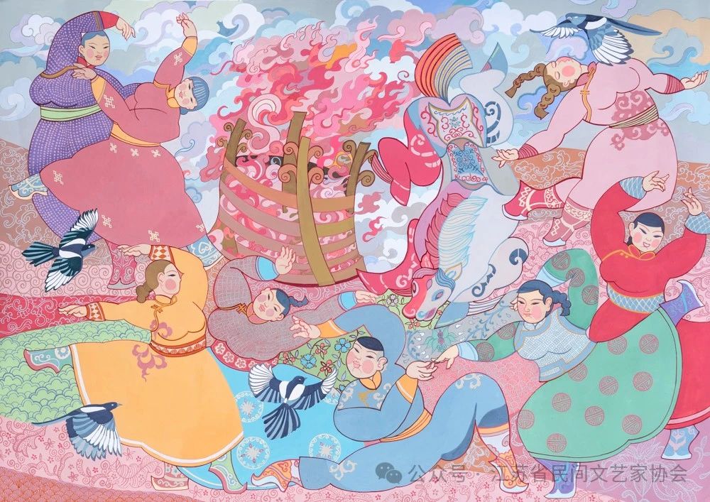 折慧刚:《多彩的土地》描绘的作者生活的地区——内蒙古,因以牧业为主。每年七、八月牲畜肥壮的季节举行的“那达慕”,是人们为了庆祝丰收而举行的文体娱乐大会。少男少女穿着盛装聚集起来,燃起篝火载歌载舞。背景主要借鉴云头纹、火纹、花纹将地面与火、烟、云自然结合起来。前景以c形构图,围绕篝火,有马儿也有草原常见的喜鹊,喜鹊报喜寓意还有喜事不断的到来,人与畜和谐相处共同庆祝草原:草美牛羊壮的丰收时节、草原儿女歌舞延绵的幸福生活。