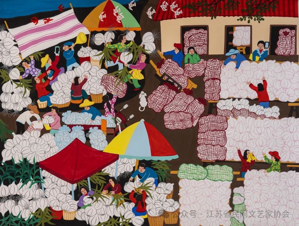 朱成梅:《蒜乡丰收乐》以生动的笔触和丰富的色彩,描绘了一个充满喜悦和活力的丰收场景。画面里,老百姓们正忙碌地收获着大蒜,他们的脸上洋溢着满足和幸福的笑容,仿佛每一颗大蒜都承载着他们的辛勤付出和美好期望。整个画面构成了一幅美丽的田园画卷。画中的每一个人物都栩栩如生,他们的动作各异,或弯腰,或手持箩筐,或搬运着满满的收获,展现了收获的忙碌与喜悦。这幅农民画不仅是对丰收的赞美,更是对劳动人民的致敬。在这个金色的季节里,老百姓们用他们的双手,创造了一个又一个的丰收年,也为我们展现了一幅充满生机与活力的乡村画卷。
