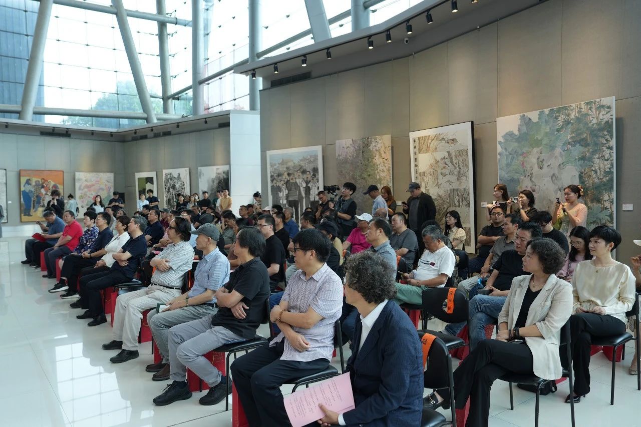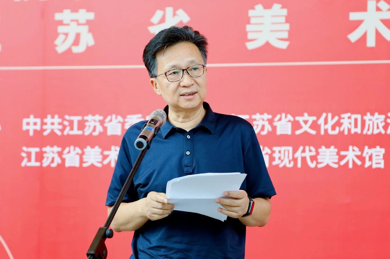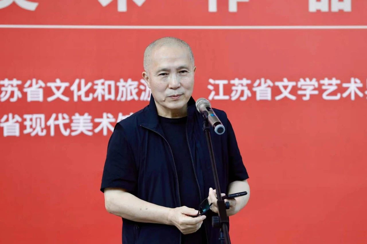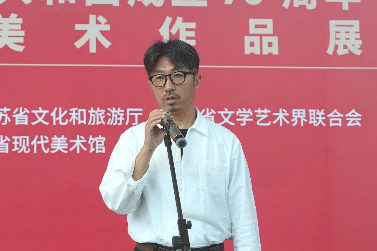 周京新致辞,他说,作为参与者,他深切体会到本次展览的辐射力。一是江苏的中国画、油画入选率在第十四届全国美展中名列前茅,感谢省委宣传部、省文旅厅、省文联的大力支持,祝贺参与的各位美术家。二是这次展览是江苏献给中华人民共和国成立75周年的丹青大礼,展示了江苏美术的底气和实力。入选省展的作品水平同样可圈可点,只是限于选送名额的限制,留下许多遗憾。三是通过展览,我们可以提升信心、总结经验、获取教训,提高自己的创作能力,调整今后的创作方向,全面加强美术综合素质。最后,祝贺入选第十四届全国美展的91位作者,祝贺入选“大道之行”的144位作者,祝愿江苏的美术创作更上新台阶。