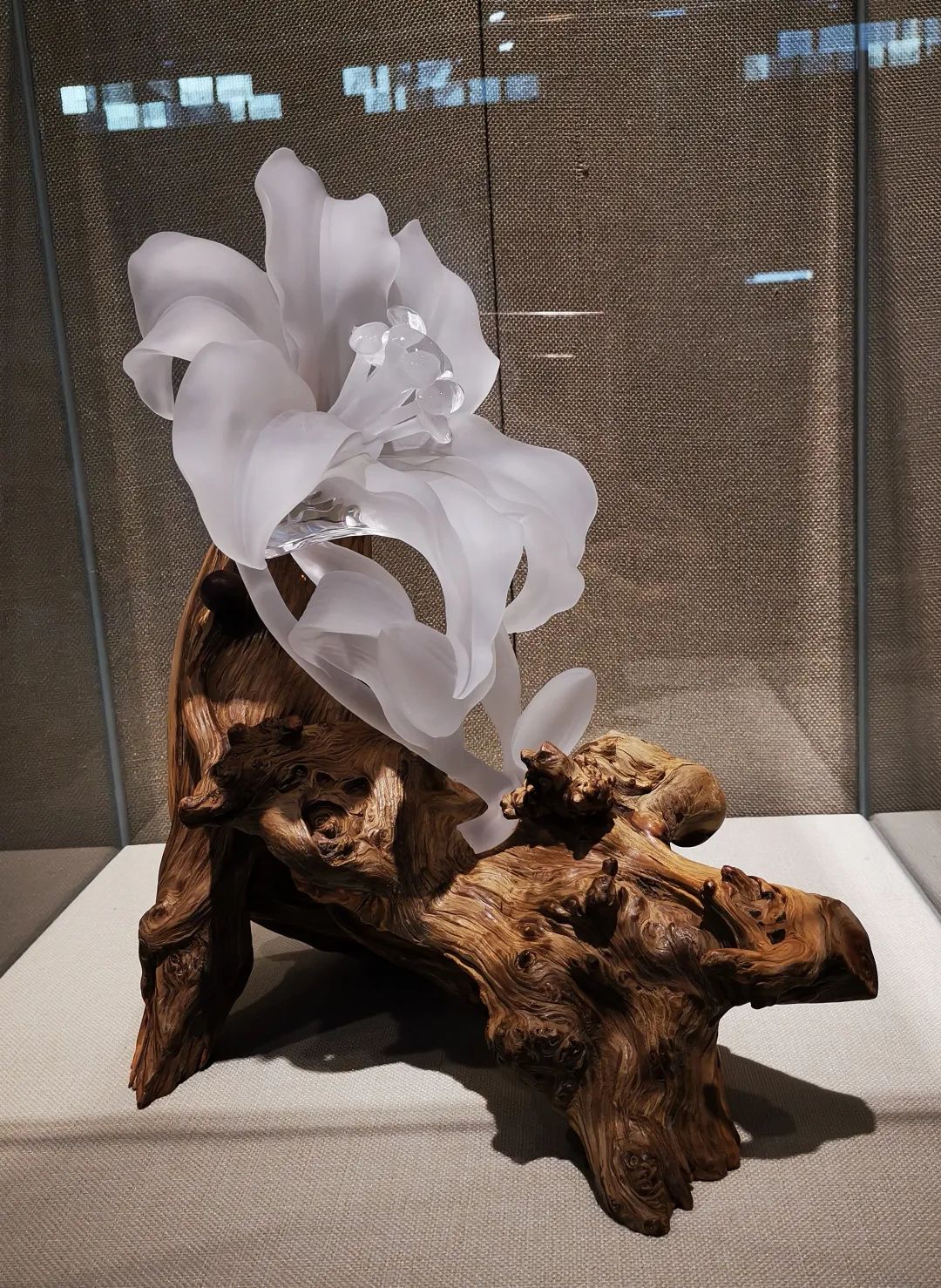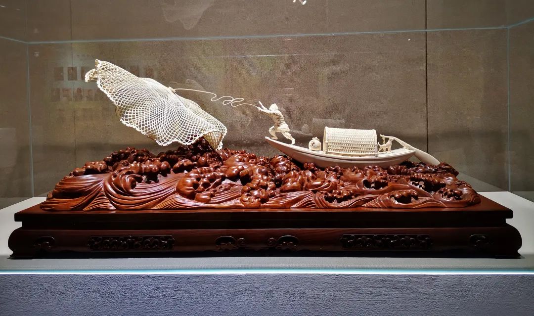 展览中,我见到一些民艺家长期创作,功力深厚,作品带上了某种“特艺”色彩,却仍然不失民艺风味。如陈旭辉水晶雕《百年好合》(图5),雕成后故意噴砂成亚光效果,而于花芯顶部抛光,于是,百合花分外含蓄动人,百合顶部的花药闪亮竟如钻石!巧用对比之形式法则,以一枝花胜多多许,这正是作品高明之处。南京江宁猛犸牙雕《撒网》(图6)是一件高难度、可以划归“特艺”的民艺作品,那人、那绳、那网为一块整牙雕成,下刀稍有不慎,就会绳断网破,前功尽弃!然而,作者却雕到渔翁体态自然,与渔网虚实呼应,整件作品有大小,有主宾,底座不用无关主题的繁冗雕饰,而以奔腾的浪花凸显撒网的紧张气氛。可见,无论功简功繁,只要把握艺术的形式规律,就能出好作品。此展中,我还喜欢湖南菊花石雕《蟹肥时节又逢君》(图7),好就好在:不滥施工巧而能把握虚与实、粗放与细致的对比,不足在:名字“文雅”了一些,更不足在:湖南菊花石开采过滥,石头里再没有了闪白闪亮的天然菊花纹!