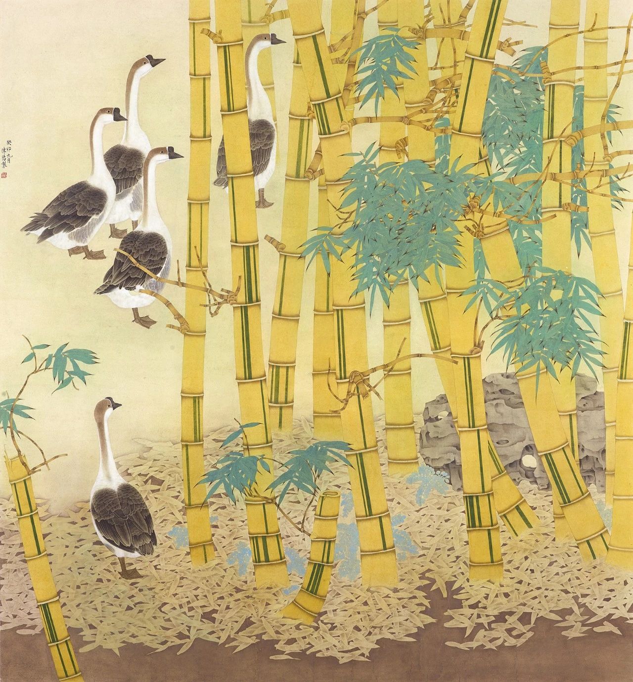 《梦回西园》的创作灵感来自壬寅年去南方的一次写生。第一次见到种类繁多的竹,对金黄的间碧竹印象尤为深刻,发觉与传统绘画中的竹类很是不同,色彩鲜艳且不失沉稳,便对其进行了数日的写生。在绘画过程中我保留了竹子的固有颜色,只对色彩倾向上稍作调整,竹叶相对主观,没有太拘泥于变化,做整体处理,前后略有呼应,色彩上以暖绿罩染。另作了几只闲鹅,信步踏去,似被竹林深处的景致吸引,画法上取法宋元经典,以黑白两色概括与刻画,略施淡赭,薄染多次而成。过程中有畅快处,也有思索时,过后回想绘画过程本应如此,表情达意也如读书写作娓娓道来耳。