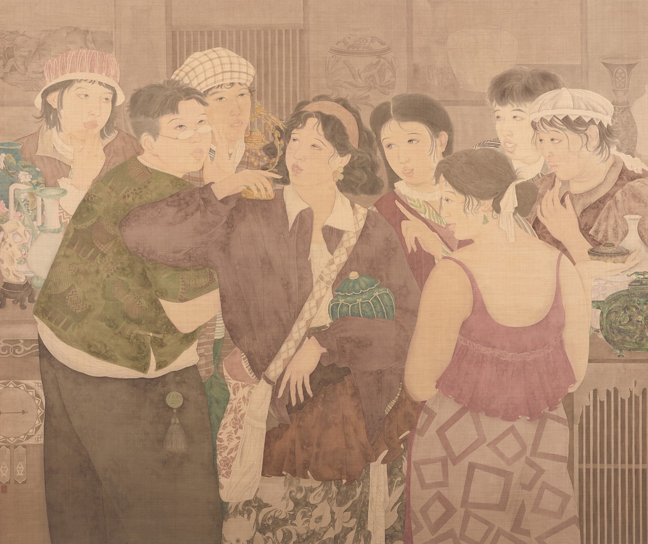 《日畅风和》取自现实生活。艺术来源于生活,又高于生活,最终又回归到生活之中。为了更好地展现生活中和谐美好的情景,我选取古董店作为绘画场景。古物散发出时间的沉淀与岁月的陈酿,它的存在与其背后传达的文化被人们所喜爱。画面刻画了八个人在古董店的场景,他们的目光集聚于中间拿古香薰盒的人手上,展现古董店一角人们品评赏玩闲情逸致的生活状态,表达我对古董店赏玩顾客神情动作的观察与绘画语言的探索。作品整体呈现赭褐的灰色调,营造古朴雅致的氛围,体现人们对美好事物的喜爱并展现生活之美,让观者感受到放松悠然的气氛。