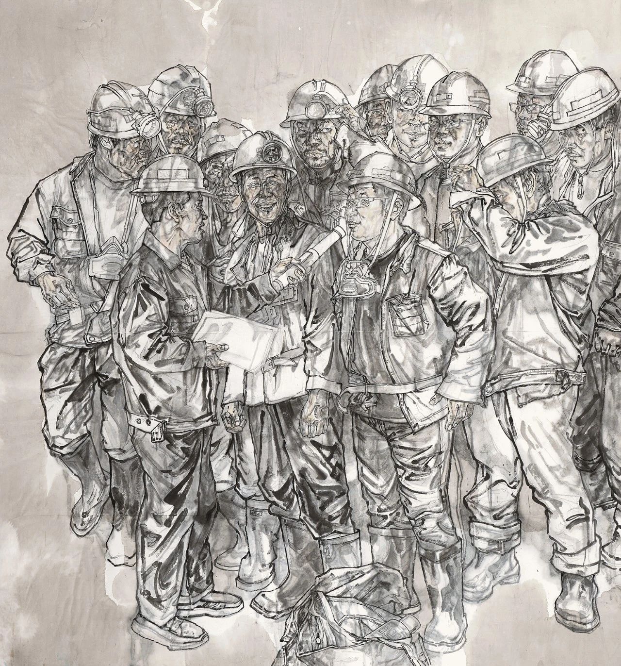 写生过程中多次深入矿区,了解当代矿工的工作现状与工作面貌。在井口收工的矿工汉子们拖着疲惫的身躯去交还设备,脸上的煤灰让人看不出他们的肤色与长相。见到写生的我们,他们脸上露出了粗犷而质朴的笑容,黑色的脸,雪白的牙齿,闪光的眼神,在视觉上形成了很大的冲击力。工友们之间的交流也很生动昂扬,那种生命的沉重感与活力矛盾地交织在一起,让人有种百味杂陈的感动。
