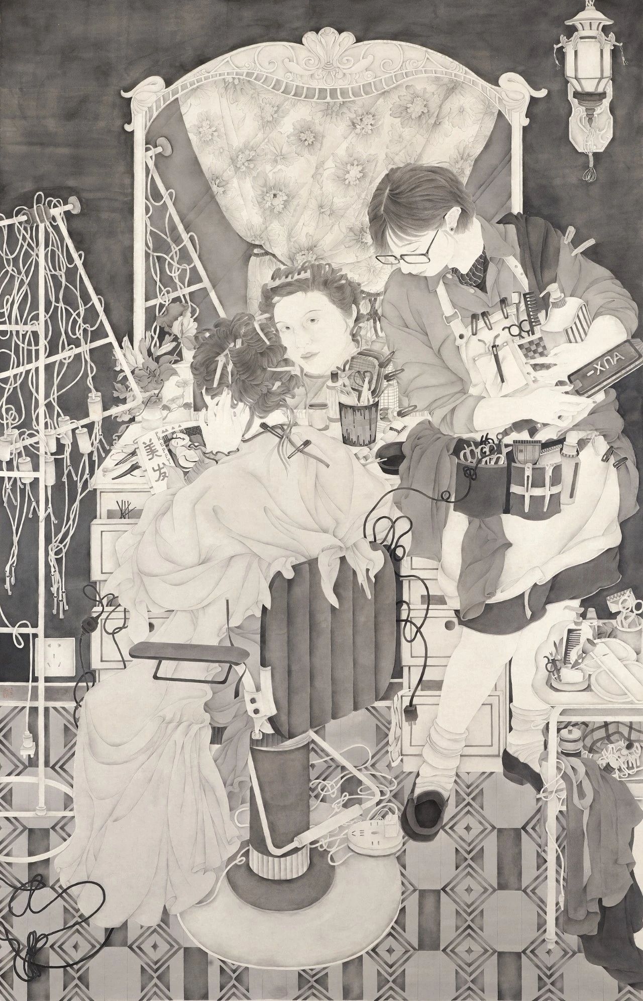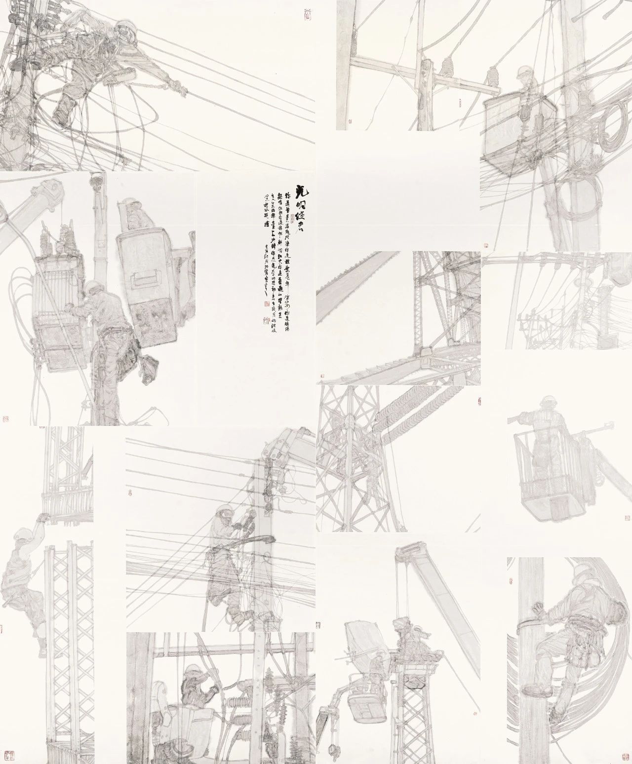 走在街头看到电工师傅在高空作业,总是感觉很有趣,仿佛在一堆剪不断理还乱中穿针引线,同时也感觉这种疏密关系很有美感,点线面恰到好处的节奏感吸引我去画出来,后来才知道这是高危作业,更有一种可入画的创作使命感。《光明使者》从有想法到画出来经历了很长时间,主要时间花在了收集资料和设计比例构图上,怎么样可以更有张力是我最要考虑的。水墨也是最有趣的,有无穷的变幻莫测的形式,尝试了无数次后终于完成了这张作品。