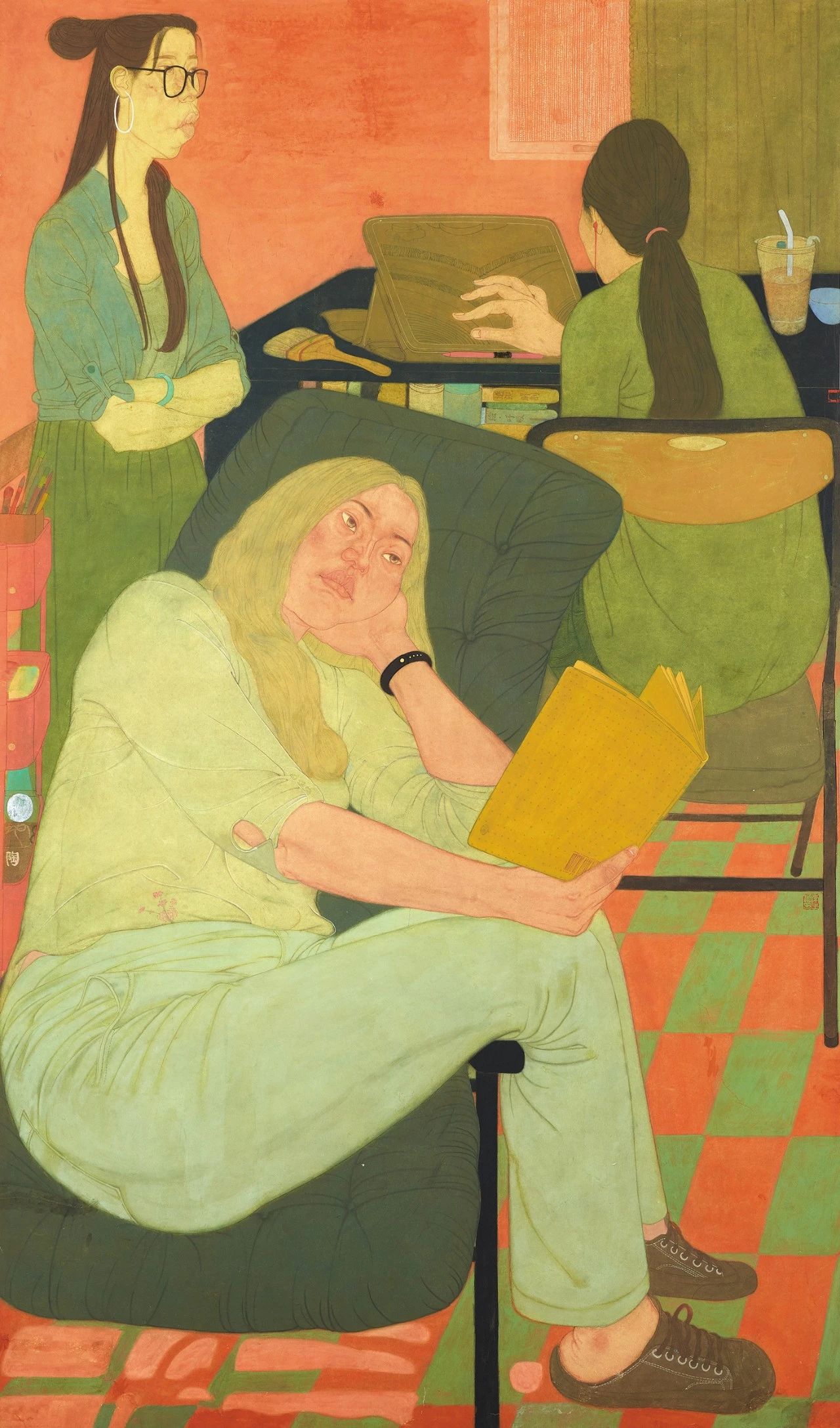 作品取材来自于身边熟悉的同学,他们每天在画室内的动态都十分打动我,我想表现我所认识的他们,表现出学生们最真实的生活状态,表达出他们在学习生涯中所体验过的快乐、迷惘、艰辛与憧憬之情。山水画论里有“外师造化、中得心源”,在人物画里这句话体现在如何反映一个既真实又有绘画性的对象,我尝试运用不同的色彩与技巧,使造型更加完善独特,色彩更加绚丽和谐,形式感更加强烈。红绿色是我读研期间比较喜欢的一组对比色,在《片刻·繁忙》系列中基本都延续了此色调。我会不断修正画面中存在的问题,不断提升自己的艺术素养。