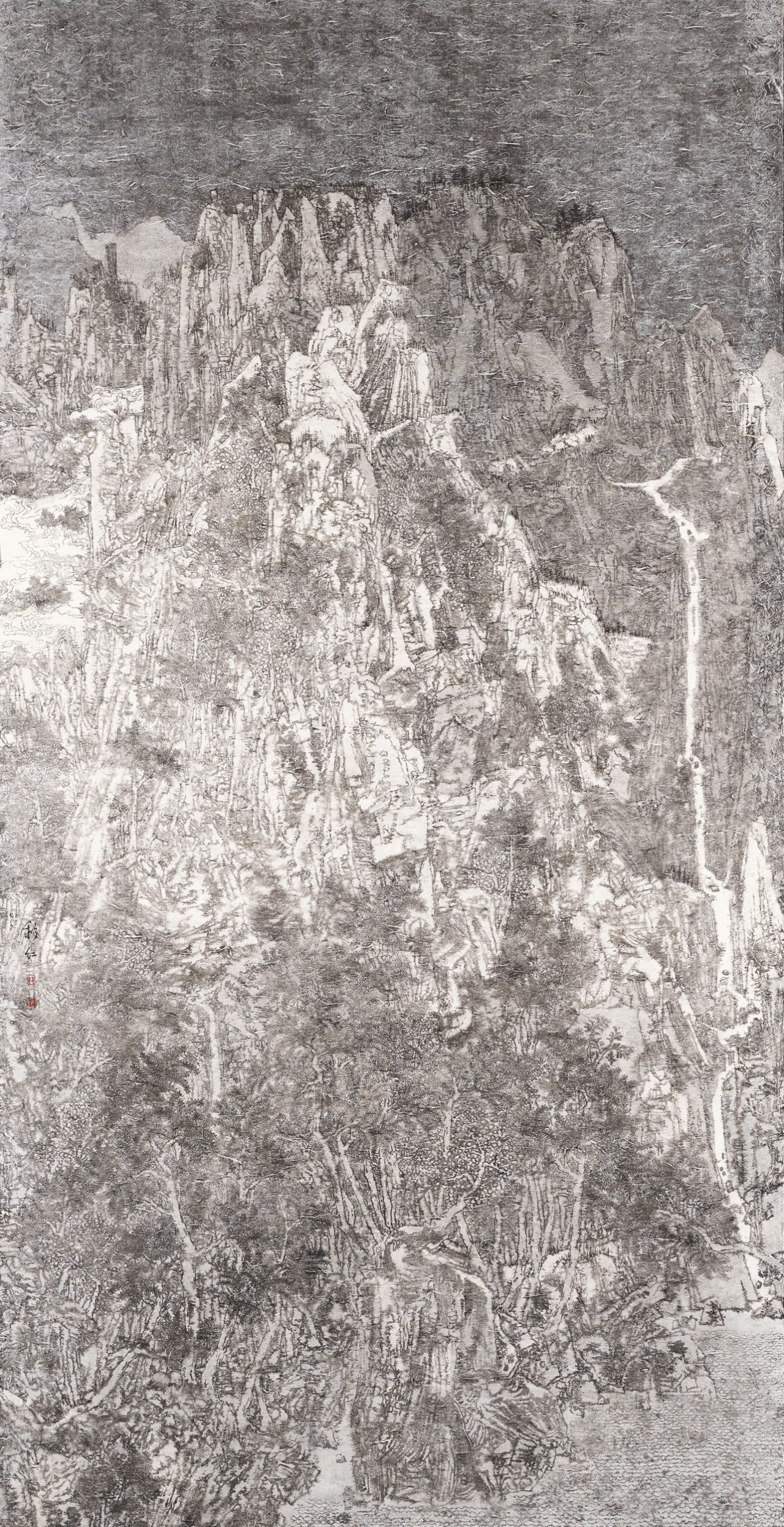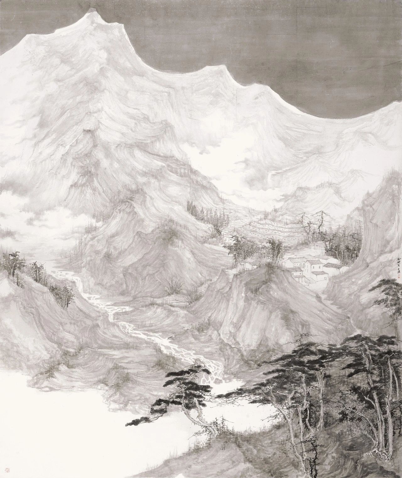 中国人对于山水自然的亲近似乎是来自于骨血里的,历代的文人墨客对于山水林泉都心驰神往,产生了众多描绘林泉风光的诗文、绘画,它们在中国文化艺术领域占有极重要的位置。山水画一直以来都是中国画里非常重要的课题,尤以宋元山水画为甚,可谓高山仰止。这几年我一直研究学习两宋、元时期的山水观及其技法,吸收营养,训练笔墨。《山居》采用水墨的方式与传统山水的远中近三段式构图,强调黑白灰对比,描绘山水田园间的村落,意在表达传统山水画的"可望""可行""可游""可居"及人与天地自然和谐共存的精神追求。