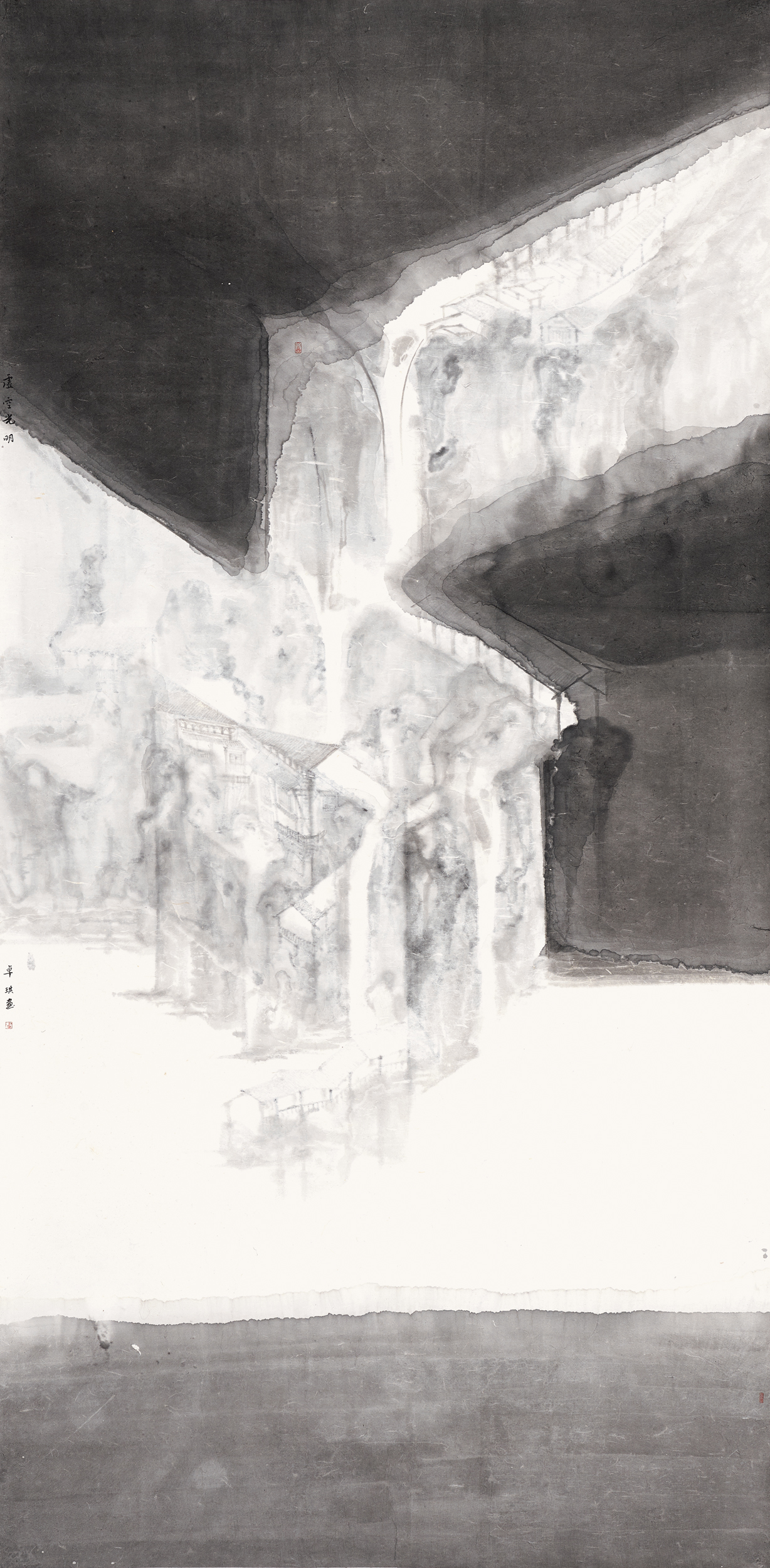 现实世界的一些存在和现象会在某些状态下变得难以理解,毫无逻辑,例如苏州的园林以夹墙、花窗、长廊、太湖石、泉溪与小桥等元素的组合变化,构造起借景、隔景、分景的构图,而当人们穿梭于园林中时移步换景,常常会引发空间上的错觉,错觉不同于假象,往往是观照事物的角度与方法的差异性导致的。除了现实空间的错觉感,梦境无意识的状态下所感受到的时空与客观存在也常常是不符合逻辑的,而一切不合逻辑、不合常理的事情在梦境中却都被允许发生,我想通过笔墨将传统空间重新拆解组合去搭建一片心中的光明地。