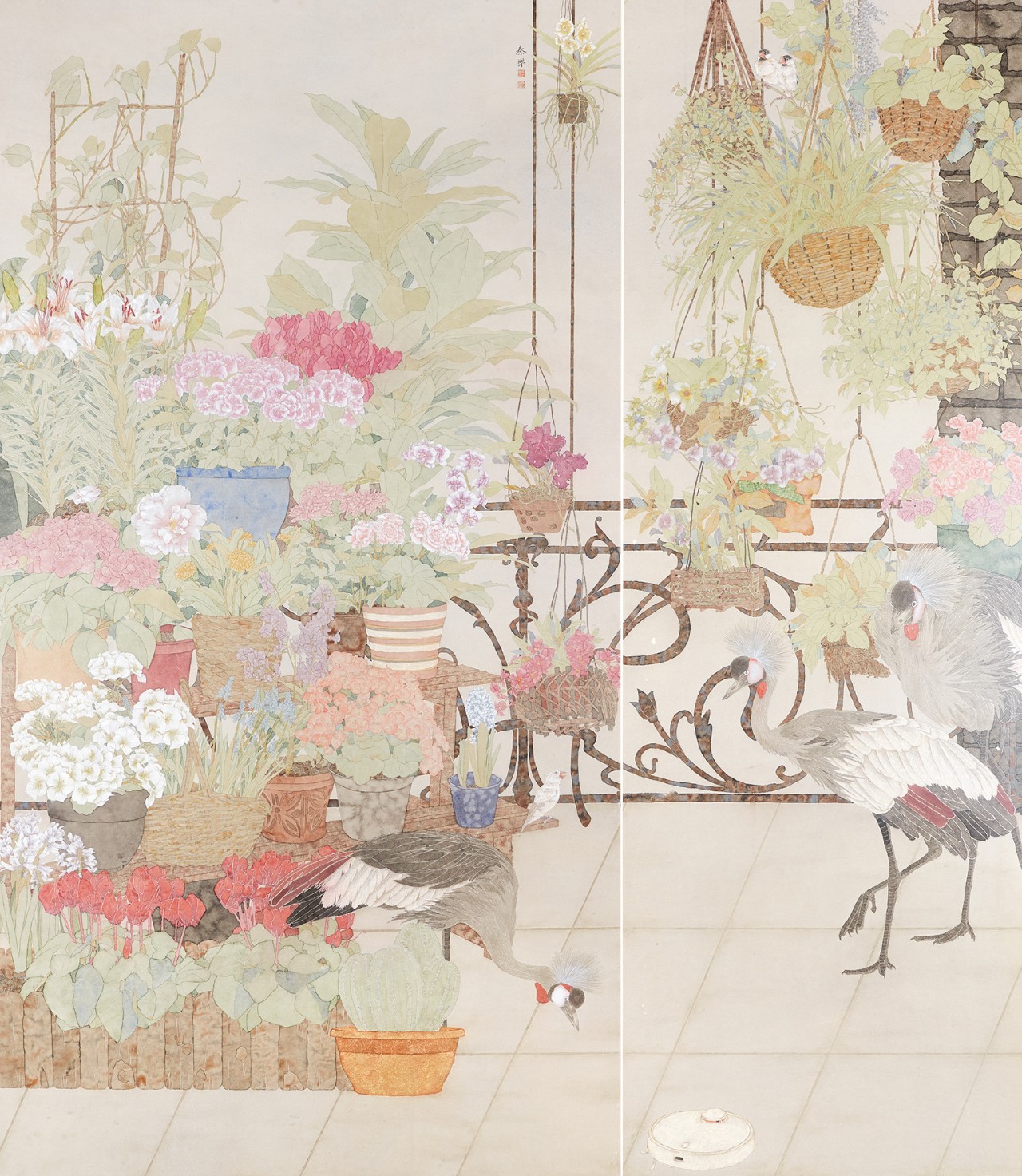 就这样猝不及防的,我走进四月了。说不清是怎样从初春一下子跨越到那繁盛的三月的,可能是经历了春的暖阳、春的鸟鸣、春的盛开。晨光从半开的窗户吹进来,轻柔而不失温度。春天是一首诗、一幅画,翻过的每一帧都充斥着美好。《春日花格》以中国传统没骨画法,创设了一幅室内的春日场景,花卉设色清新淡雅,构图以春日花卉为主,交错排列,画面动静结合,鸵鸟在画面里显得生机有活力,现代化扫地机器人的出现,与传统笔墨相得益彰。一直觉得,画画,不一定是想苛求什么,唯愿在心里播下一颗爱与美的种子,随着日子见长,总有一瓣心香。