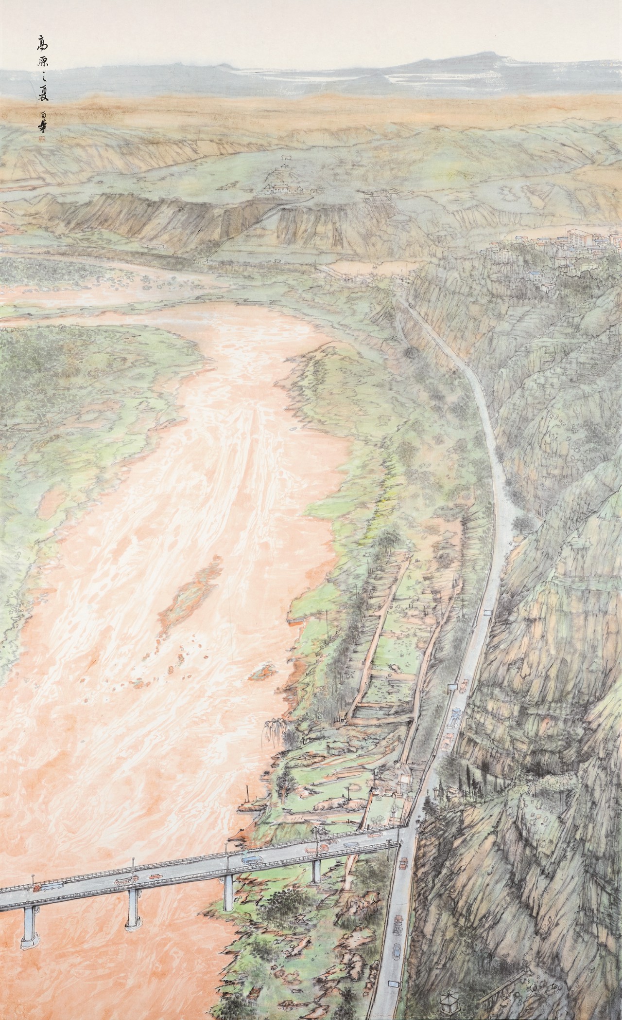 作为艺术工作者,“黄河”一直是我渴望却又不敢轻易表现的一个题材。黄河是中华民族的“母亲河”,它奔腾不息,孕育了源远流长的华夏文明,滋养了世代的中华儿女,更催生了众多的文化作品。如何凭借中国画简括的笔墨说好“黄河故事”,是我一直思考的问题。在请教了众多前辈与挚友之后,我着重从构图、行笔、设色三个方面结合传统笔墨,对“黄河”题材进行探索,几经易稿,最终完成。