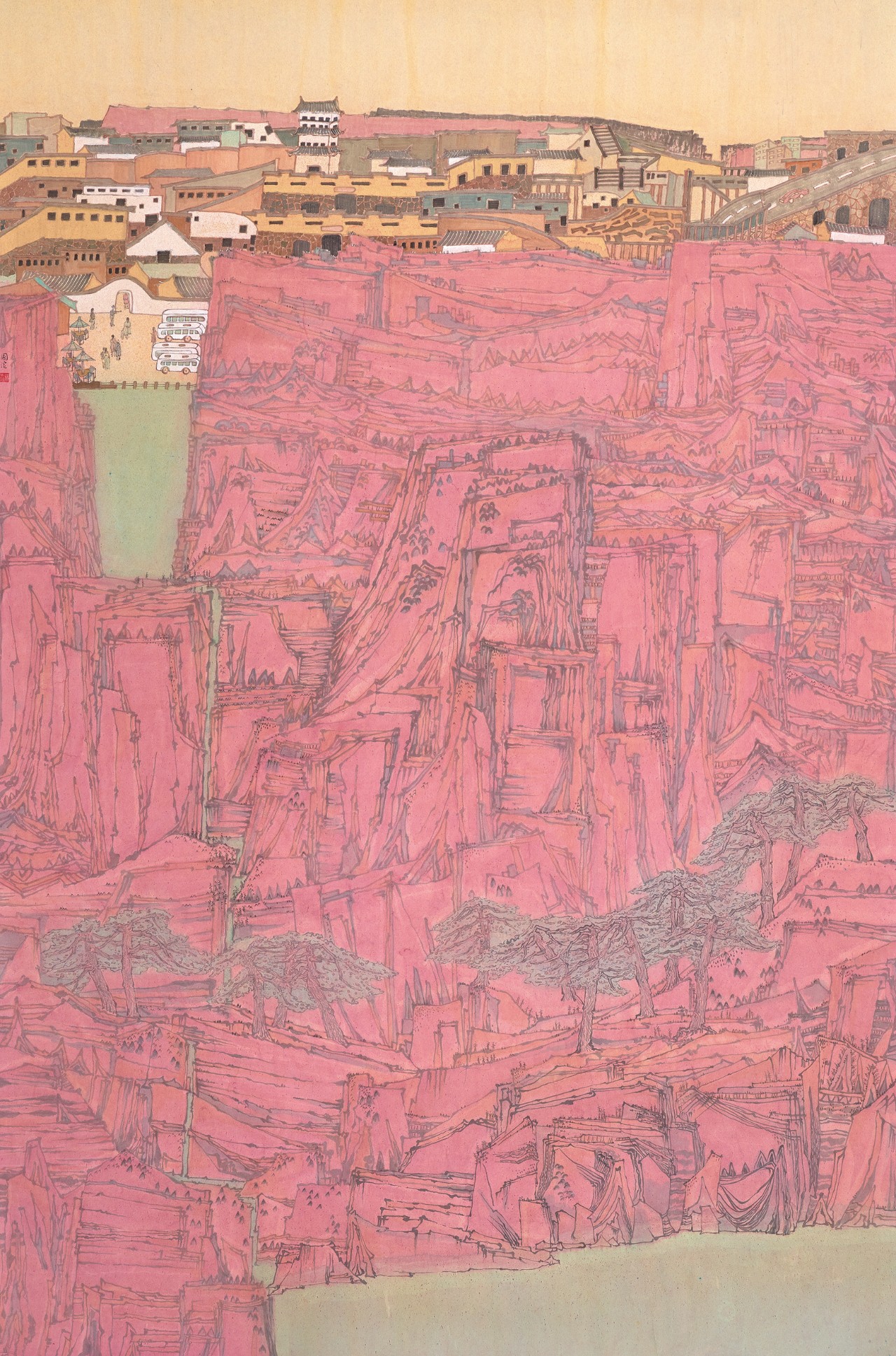 “游山系列”的创作源于自身对自然景观的向往,山脉、河流、湖泊、森林等组成的独特自然风光,深深吸引着我。它以“扎根本土、深植时代”为创作基础,反映当代人民大众对美好生活的追求。《游山4》以自然山脉为主要创作元素,搭配聚集的建筑,在构图上形成强烈的块面对比。在创作时,我追求简洁与和谐的统一,画面中红灰色的山体、黄灰色的建筑与天空构成和谐的暖色调,树木、河流采用纯度较低的绿色,以此弱化色彩的反差,整体而丰富。点景采用人物、公交车等现代元素,富有时代气息,使观者以轻松愉悦的心境游历山水。