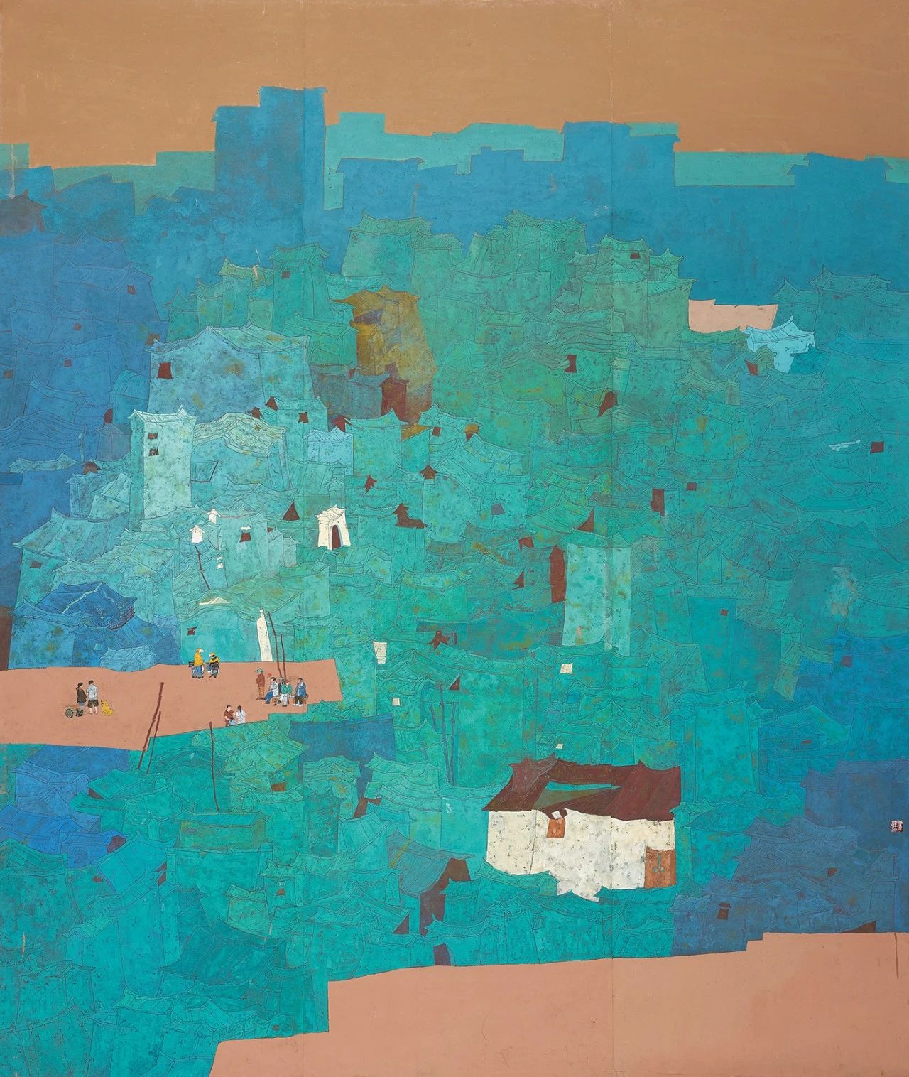 时代的车轮滚滚向前,生活节奏不断加快,行色匆匆的人们也许需要放慢脚步去探寻生活中的美好。《夏日小记》以徽派建筑为基本元素,将传统青绿色与现代构成相结合,并运用没骨技法进行创作,借以表现皖南初夏雨过天晴的乡村之景。放眼望去,经过雨水的洗刷,空气中存有丝丝寒意且变得明净清新,老人三五成群地坐在一起畅聊往事,外卖员沐浴着午后的阳光小憩,三口之家幸福温馨,一旁的金毛正乖坐在主人面前。时光在这里变得不紧不慢,坐在村口,等一场夕阳西下,最是让人憧憬的生活大概便是如此了。