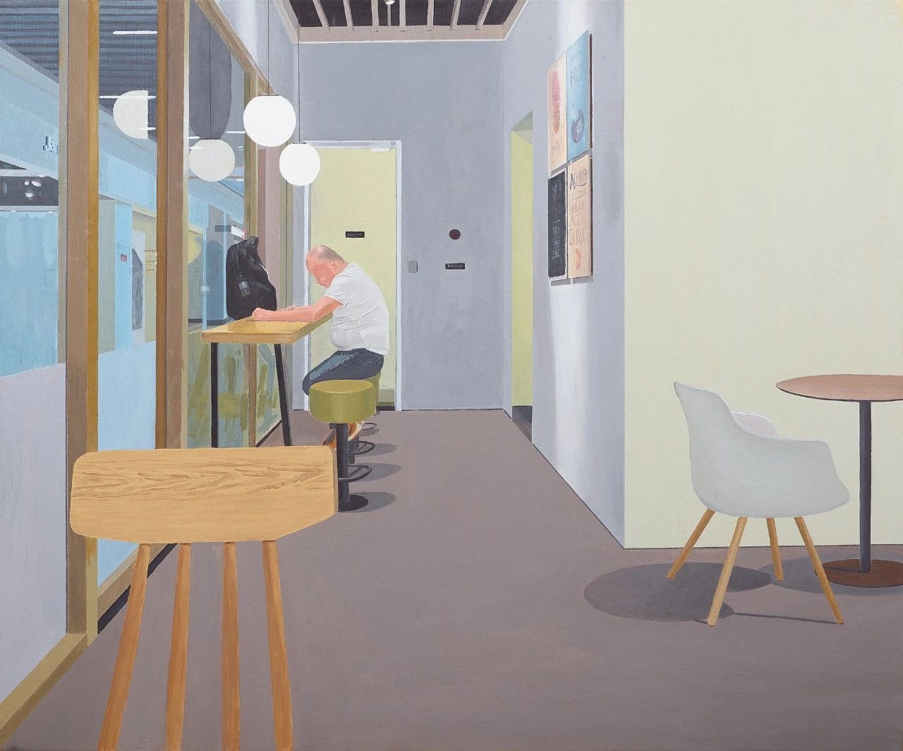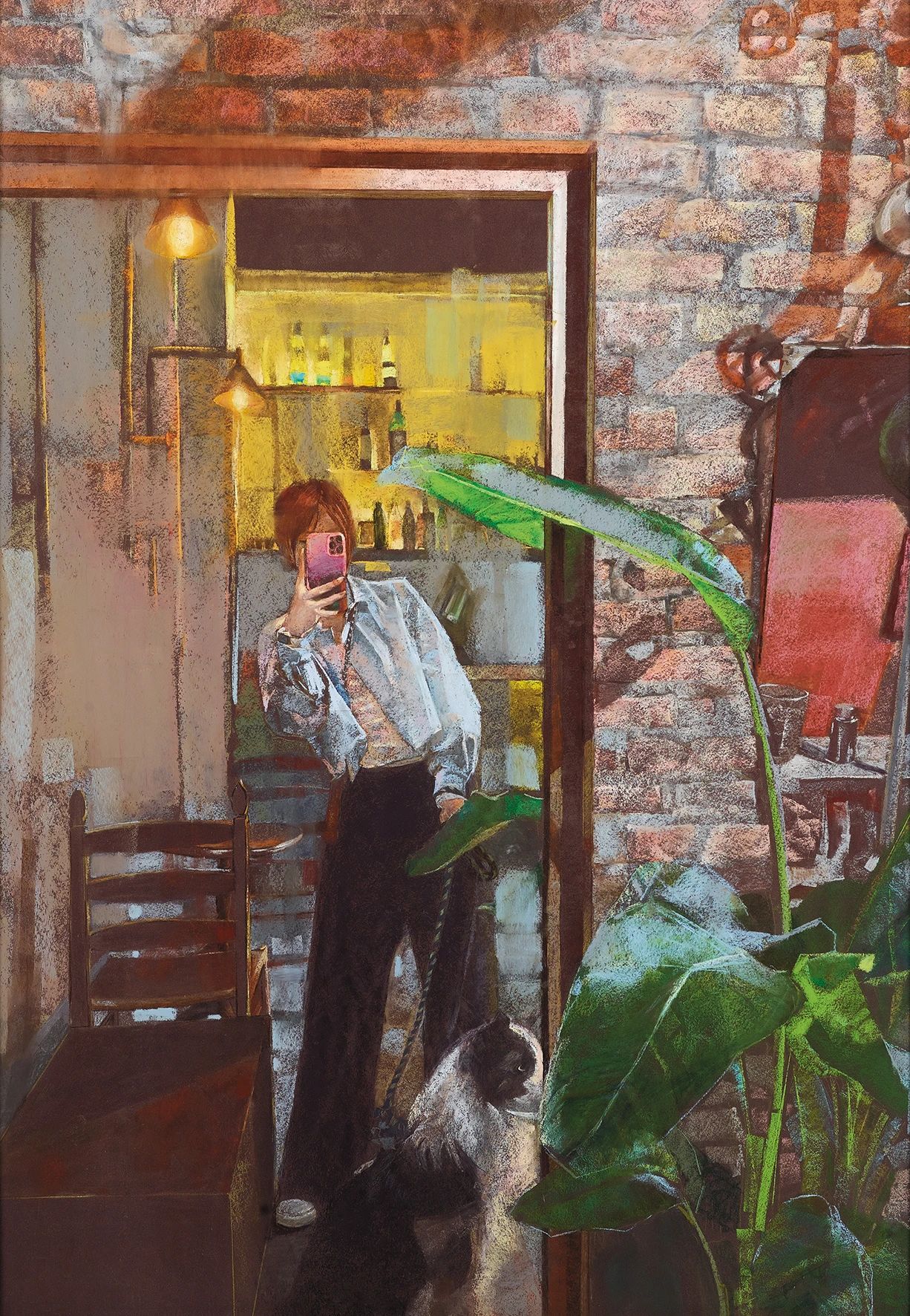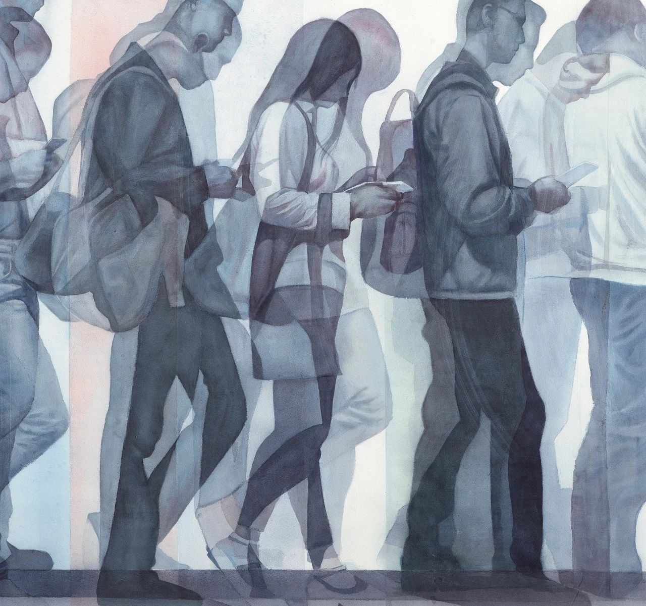 沿着一条寂静的线,潜入现在生活的本质。在喧嚣的日常之间,我们的生活究竟在何处,我们应该将灵魂的寻求放置何处?这是我所寻求,也是我在创作中一再渴望突破的。这幅画表现了在沉迷于手机的一片片躯壳中间,每个人都带着自我笼罩、自我保护与自我屏蔽。在这个沉溺的静默时代,灵魂在高处俯视着,跟随着,也用无声的方式唤醒着,唤醒着推不开的默,与溺于喧嚣的静。我们都将在无数次的自我重逢中遇见崭新的自我,直到某一日的静默裂开一条明媚,让希望的风与真诚相拥。