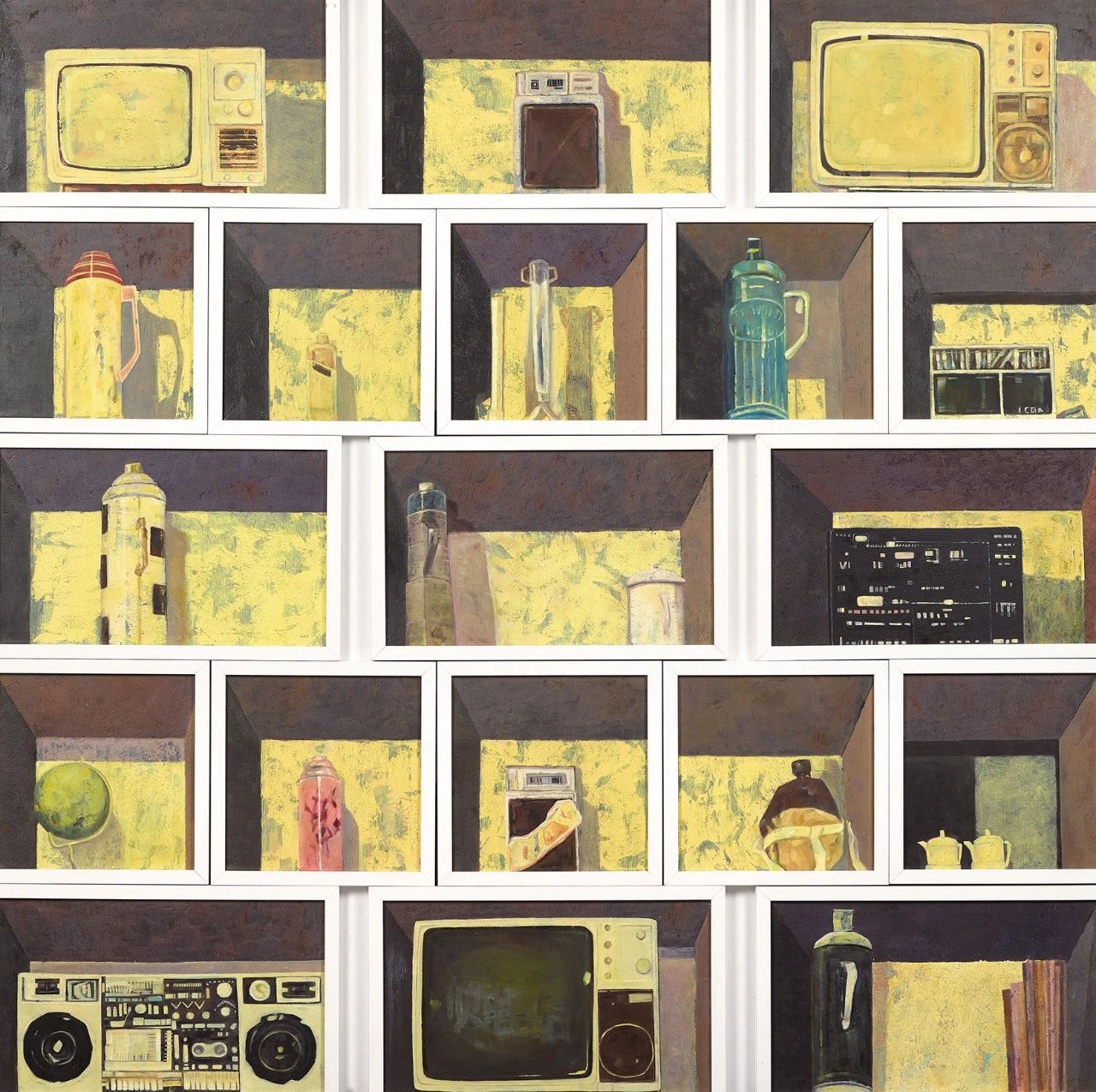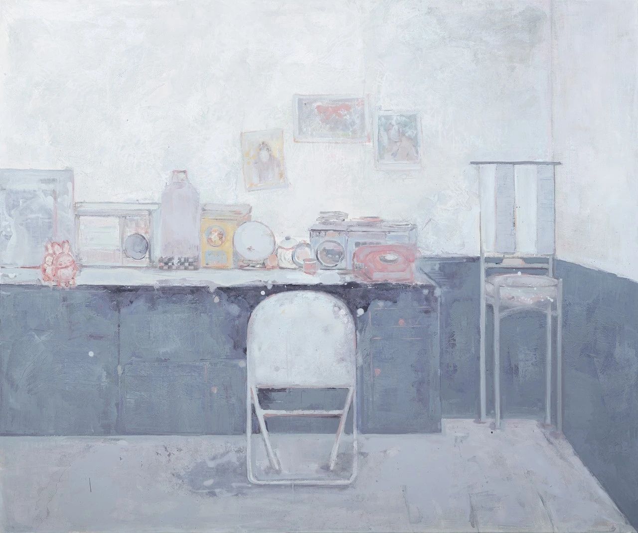 《静寂闲雅》取材于家乡小镇里的老物件。它的重点不在于对老物件进行外貌“还原”,而是突出旧物的静寂,制造记忆永存的氛围。整幅画追求“静”,既要体现时光的繁复,又不能打破午后的宁静。我对眼前的旧物进行安排与重整,修改旧形式,强调绘画的平面性与趣味性。整幅画以柔和的灰色调为主,追求闲舒的优雅。我在这幅画描绘的虽是生活中微小平凡的光景,但在这个飞速发展、求快求新的社会里,这些景象奢侈又珍贵,赋予了每个人不同的生活意义。