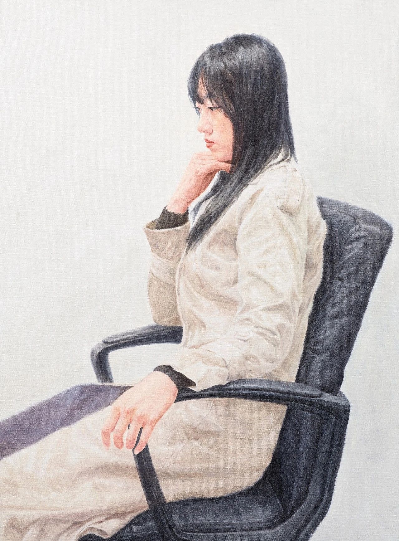《画室的黄色沙发》描绘了朋友秋雯在画室小憩的场景,轻松舒适的氛围让我很想把它表现出来。我喜欢文艺复兴时期湿壁画褪色后淡雅的色彩关系,同时也钟爱油彩颜料的透明质地,一直希望能融合它们的特点来表现自己对颜色的感受。为了更好的体现颜色细微变化,作画过程中更多强调了固有色的差异,并放弃大部分明暗与体积关系来达到目的。对于留白的应用也是我一直在坚持的一种尝试,希望能在油画媒介的使用上延续些许中国的传统审美。