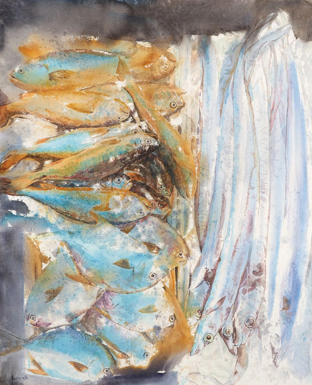 经常漫步在海边的各个码头,看渔民们在海上作业一段时间后带回来的满满的丰收成果。这一筐筐各种各样的鱼交错放在一起,像一幅美妙的图画。鱼身上的各种颜色自然撞击融合在一个框子里,这样的画面有一种天然偶得感,这种偶得感吸引我去表达。我试图用水彩将这各种各样的鱼、将这种美好形态重新在画面上组合,让意料之外的颜色在纸上呈现,也是对劳动就有收获的表达。我想,画面美感是建立在丰收之美上的,对丰收成果的赞美,也是对劳动的赞美,更是对生活的赞美。我喜欢这样美美与共的生活!