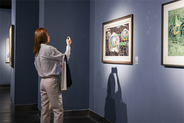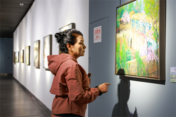 展览现场,一幅幅美术作品呈现着新疆自然之美、人文之韵与发展之变。画笔游走、色彩流动间,青金石调制的天山冰川色料泛着冷冽光泽,工笔勾勒的艾德莱斯绸纹路与油画肌理交织,传统木雕纹样融入现代构图设计,展现出多民族文化交融的独特审美。不少南京市民通过画作中对伊犁河谷、天山草原等地的描绘,感受到新疆多元文化的魅力,期待有机会到新疆实地领略。