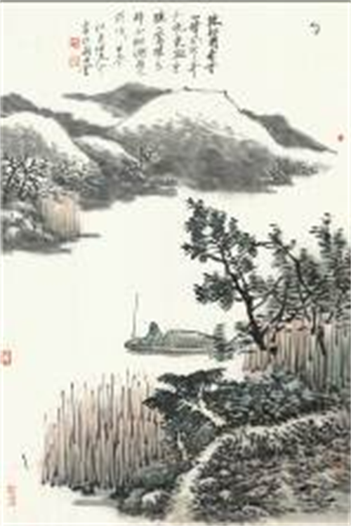 陈危冰《四时田园杂兴》系列的大多作品采取了时下中国画流行的“满构图”,“三面实一面虚”,但并非密不透风,而是注意虚实相间,繁简适度。近年画家意识到“画田园山水更需要画得空灵”,“要用虚来代实,虚实相间”,因此他的有些作品例如“晚春三:蝴蝶双双入菜花,日常无客到田家”、“秋日七:中秋全景属潜夫,棹入空明看太湖”,画面留有大片空白,更显得意境空灵,也符合原诗“日常无客”“棹入空明”的描写。画家的冬日田园诗意画特别注意留白,如“冬日六:放船闲看雪山晴”。