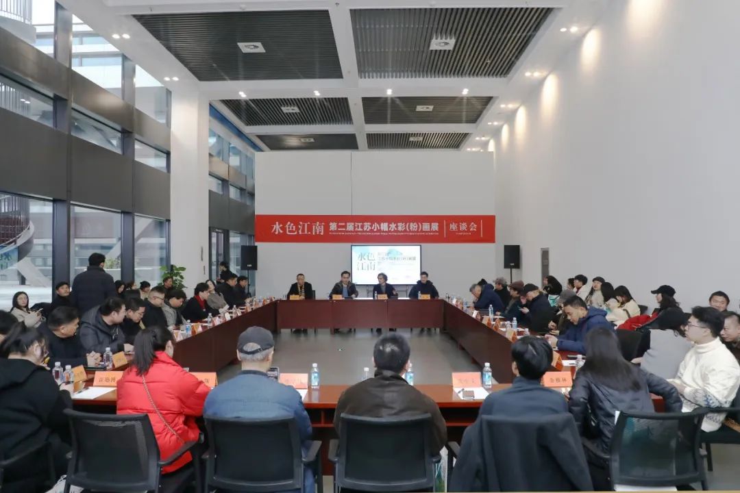 开幕式结束后,举行了“水色江南——第二届江苏小幅水彩(粉)画展座谈会”,陆庆龙、李庆、参展作者代表及到场画家50余人参加。